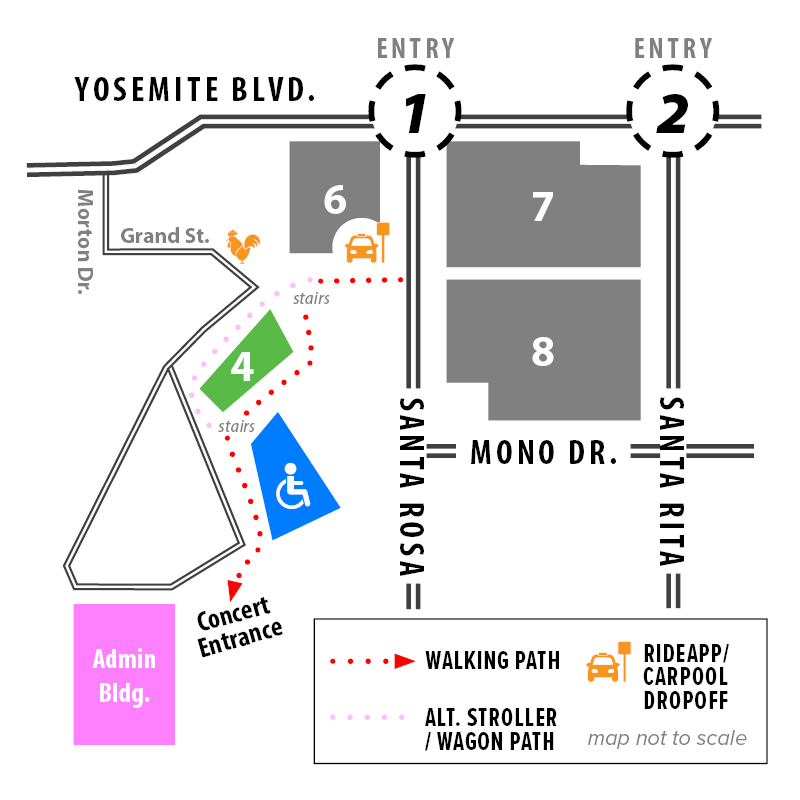 Use address 154 S Santa Rosa Ave., take Entry 1, and follow the signs to the right for RideApps drop-off and pick-up. From there you will walk approximately 1/4 mile to the event entrance.