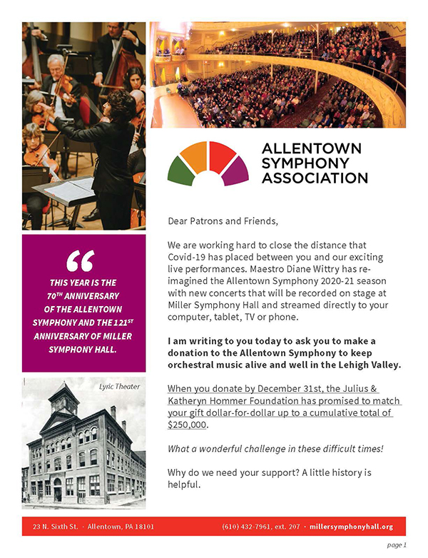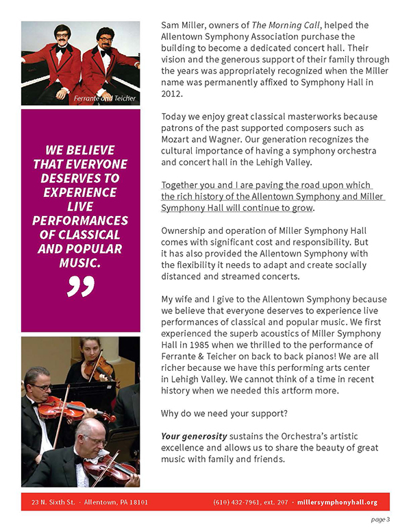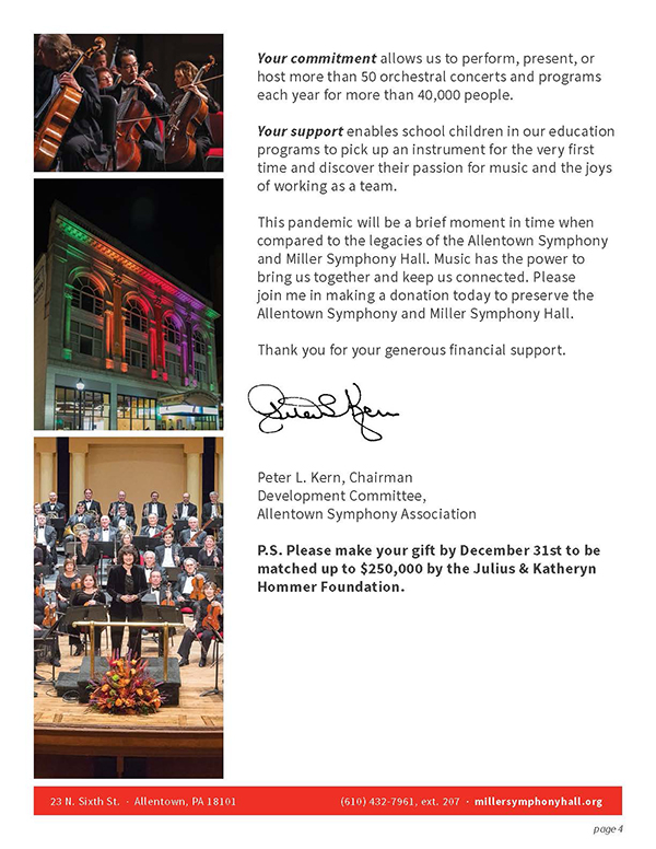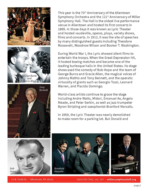 Your gift helps assure that the Allentown Symphony Orchestra will continue to enrich the lives of your family, friends, and neighbors through exciting live performances from historic Miller Symphony Hall.