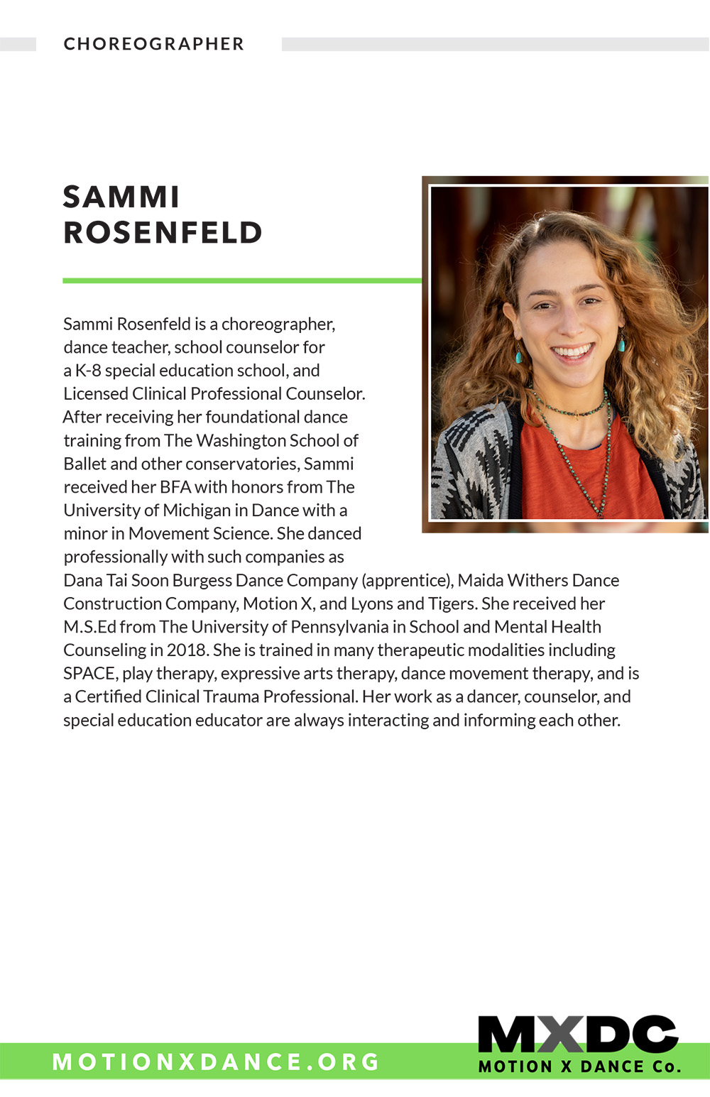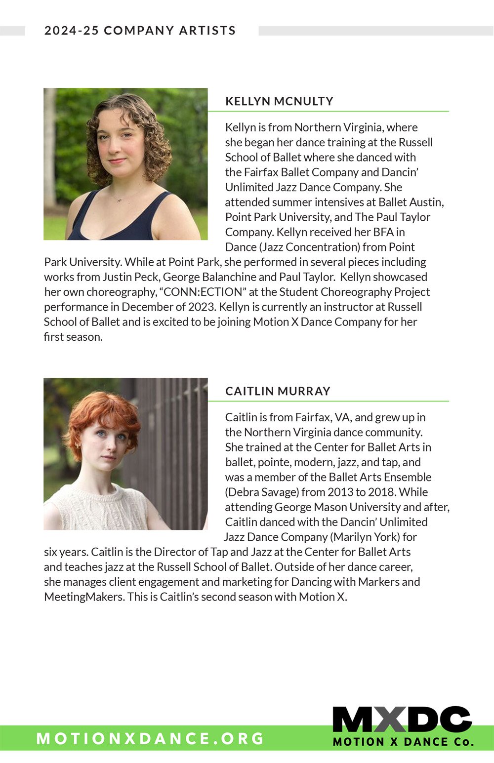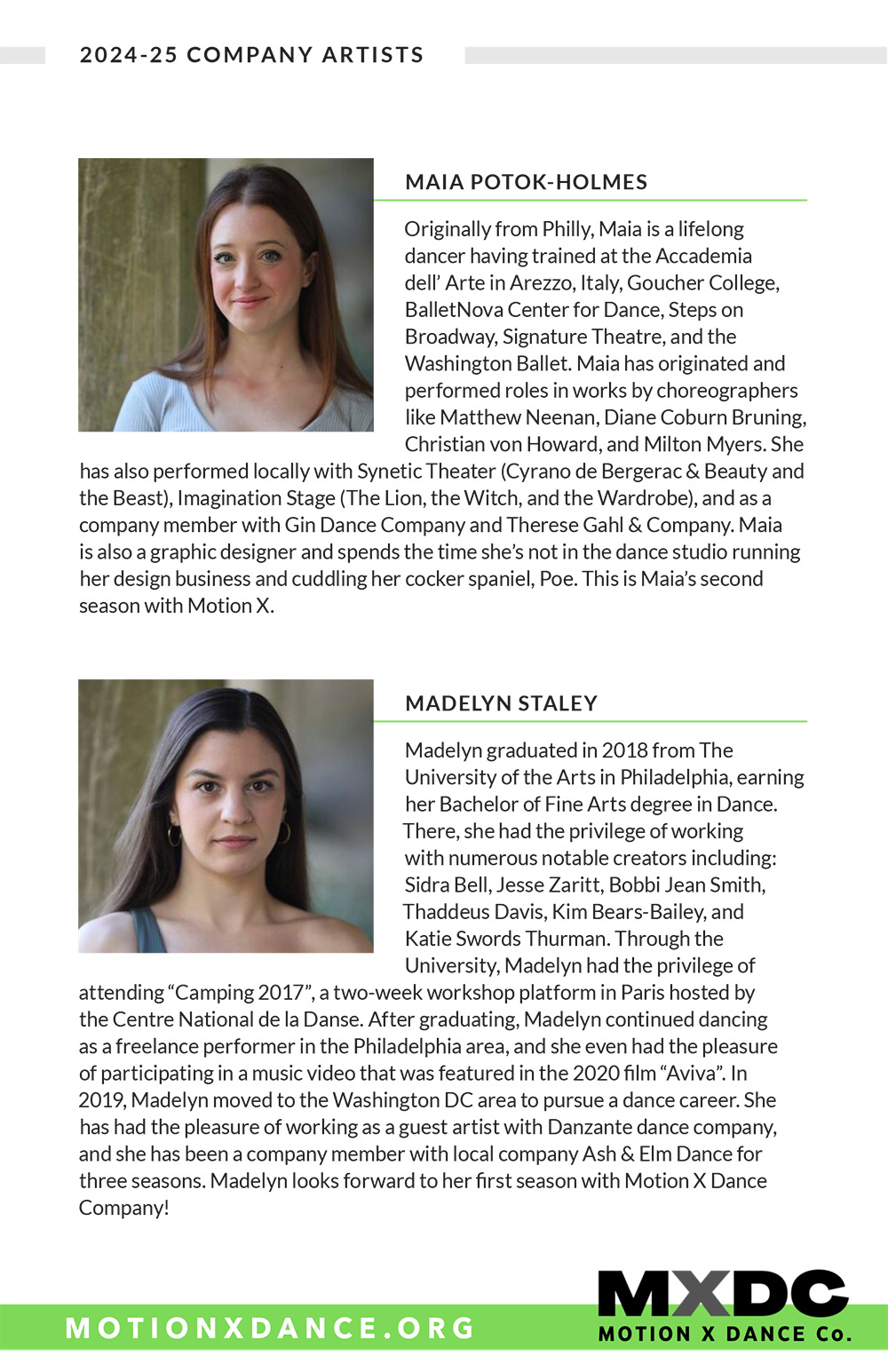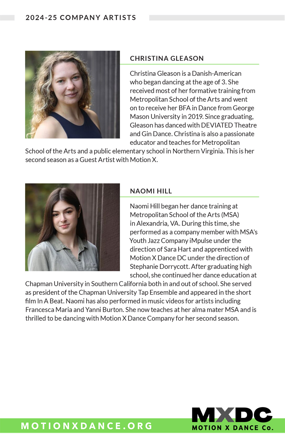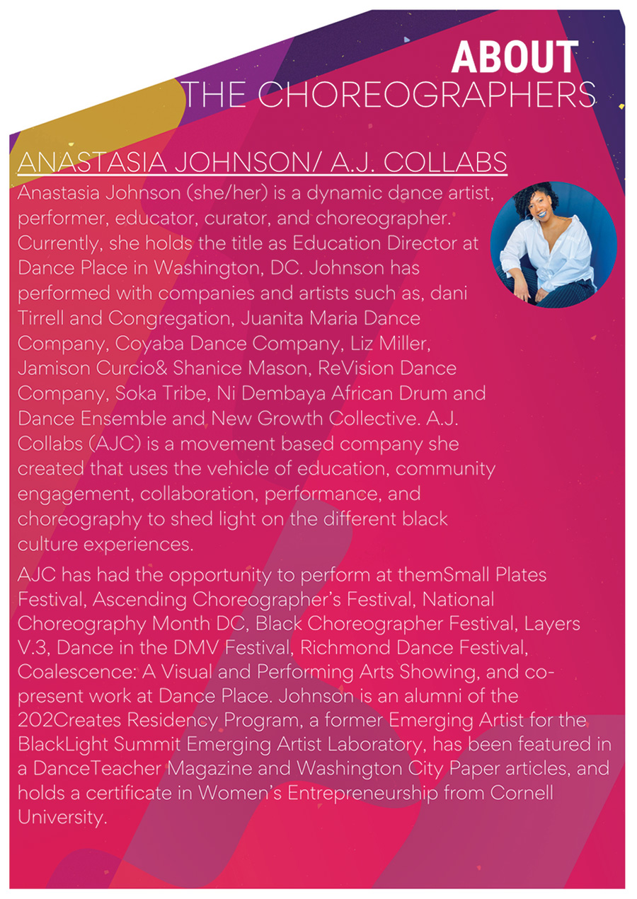 Margaux Lieser began her dance training in Chicago at the Joel Hall Dance Center She attended Vassar College, where she was a member of the Vassar Repertory Dance Theatre, served as the Artistic Director of a student run dance company, and choreographed 7 dances. She was commissioned to choreograph as Guest Artist for the Vassar Repertory Dance Theatre. Since relocating to DC in 2018, she has been a member of Capitol Movement Dance Company, where she has worked with Cat Cogliandro, Mike Esperanza, and TiJanie Carson. She has presented 4 works for the National Choreography Month DC showcases. Her choreography--jazz-based--aims to fuse the styles she has learned, with a strong emphasis on rhythm and musicality.