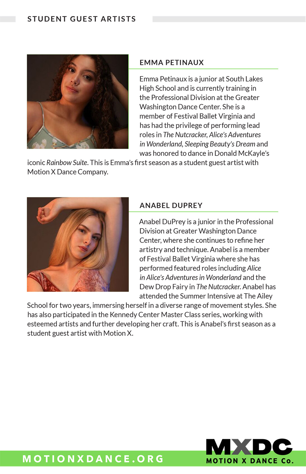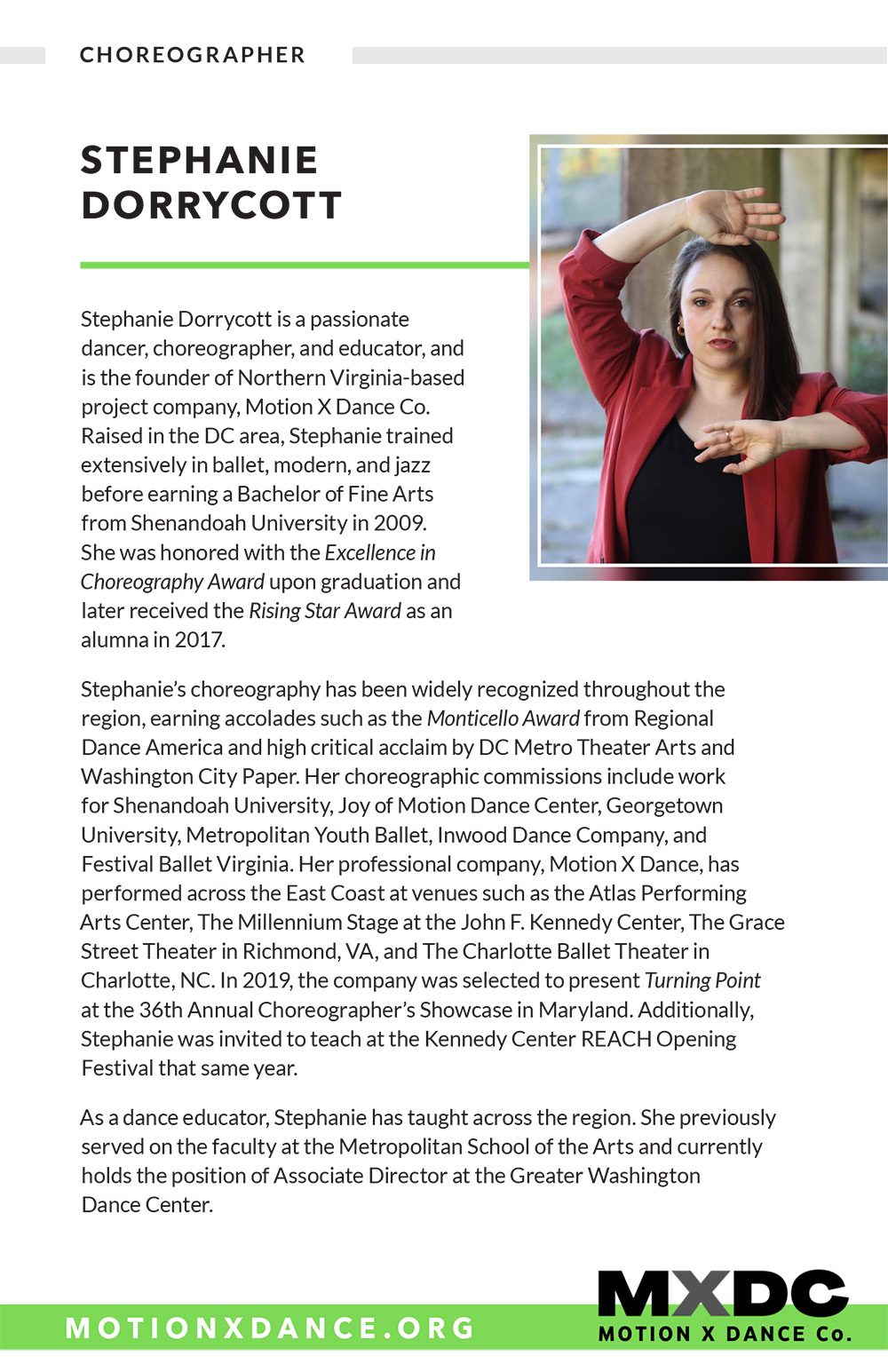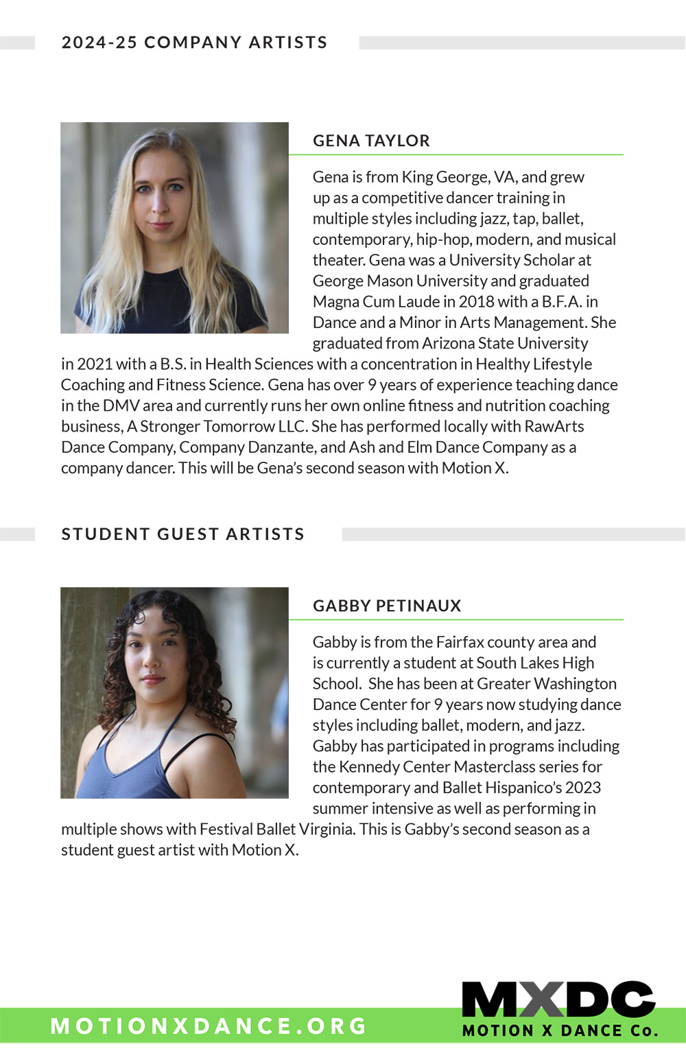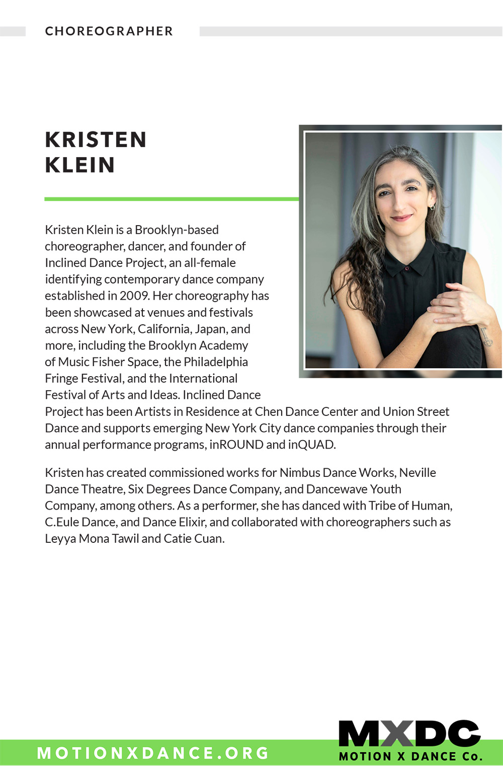 Margaux Lieser began her dance training in Chicago at the Joel Hall Dance Center She attended Vassar College, where she was a member of the Vassar Repertory Dance Theatre, served as the Artistic Director of a student run dance company, and choreographed 7 dances. She was commissioned to choreograph as Guest Artist for the Vassar Repertory Dance Theatre. Since relocating to DC in 2018, she has been a member of Capitol Movement Dance Company, where she has worked with Cat Cogliandro, Mike Esperanza, and TiJanie Carson. She has presented 4 works for the National Choreography Month DC showcases. Her choreography--jazz-based--aims to fuse the styles she has learned, with a strong emphasis on rhythm and musicality.