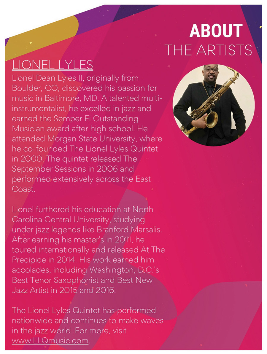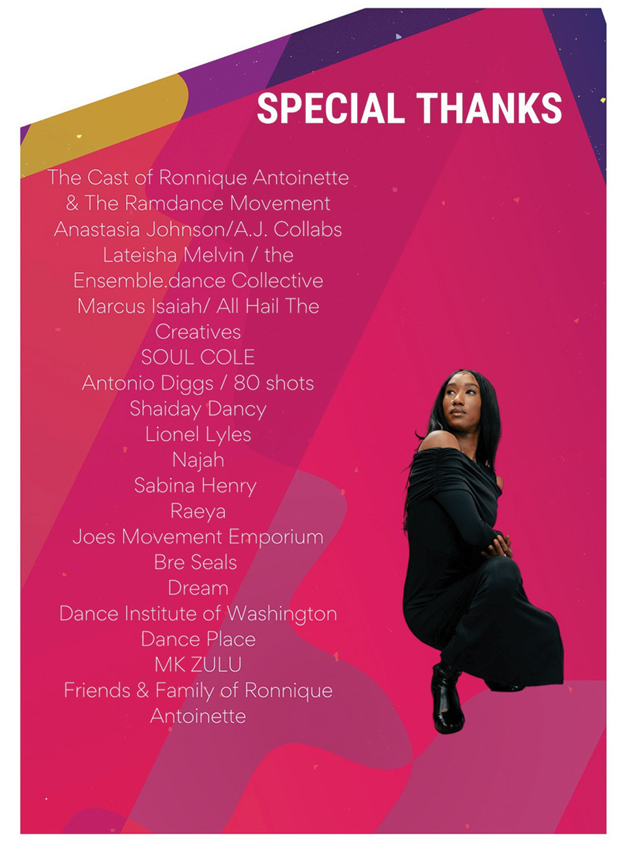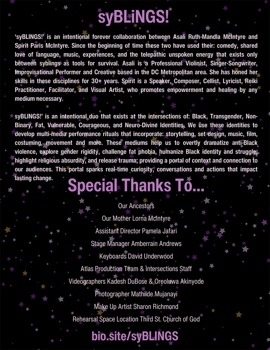 We would like to thank the Atlas Performing Arts Center Intersections Festival for the opportunity to present this show, the Rob Orwin Trio (Rob Orwin, Jody Myers, Paul Salfi) for their talent and generosity, Devon “Steeltoe” Wallace for his contributions in the early stages of the project, and dancer Victoria Winter (speedy recovery!).