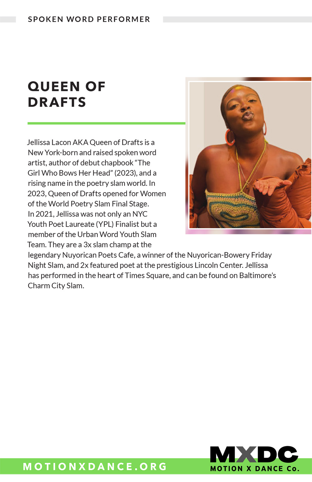 Shayla Watkins trained at Junior Mode Shoe and Dance, Oxford Academy and Joy of Motion, discovering her love of hip hop. She was a singer/dancer at the Friends of Carter Barron Foundation for the Performing Arts, discovering her love for jazz dance. She studied with Dwayne Murray and worked under Mike Malone, cofounder of Duke Ellington School of the Arts. At Phyre Arts and Entertainment, she was a hip hop and jazz dancer and model. She performed for years with Momentum Dance Theatre in its Jazz Hip Hop Nutcracker; she has choreographed for its current holiday show, the NutcracKer’s Guide to Getting UnPlugged. At Phyre Arts she discovered her desire to teach. She taught hip hop at Expressions Dance Studio, later becoming Artistic Director at Studio Boombox alongside Lionell Keit. Since 2017, she has been teaching hip hop at Momentum Dance Theatre’s studio, momentum dance & fitness.