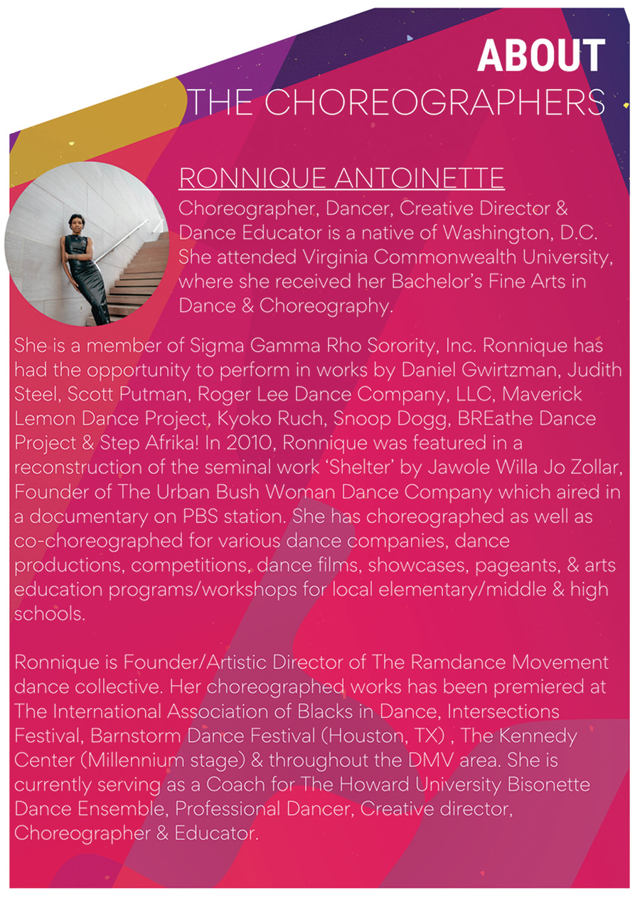 Roberta Rothstein’s dance career spans 50 years as a performer, educator, choreographer, and director. Born and raised in New York City, she trained as a child with Russian Vaganova ballet Master Seda Suny. She left dance but returned as an adult to train at the Alvin Ailey American Dance Center and the Clark Center. Her Master Teachers include Jazz: Pepsi Bethel, Nat Horne, Luigi, Lynn Simonson, Joel Hall, Danny Buracezski Lou Conte, Graham: Bertram Ross, Mary Hinkson, Horton: Milton Myers, Marjorie Perces, Limon: Lenore Lattimore, African: Charles Moore. In Chicago, she was a member of the Joel Hall Dancers for 6 years where she worked with Paul Sanasardo and Talley Beatty, studied with Larry Long (Ballet), Nana Solbrig, Denise JeJerson and Anna Czajun (Modern) and performed in musical theater. In Washington, DC, she founded Momentum Dance Theatre in 1986. As Momentum’s Artistic Director, she created groundbreaking social change dance theater and unique nutcracker productions. She is owner of Momentum Dance & Fitness Studio, and Director of its Jazz Hip Hop Academy. Momentum has performed throughout the DMV and toured twice to New York City.