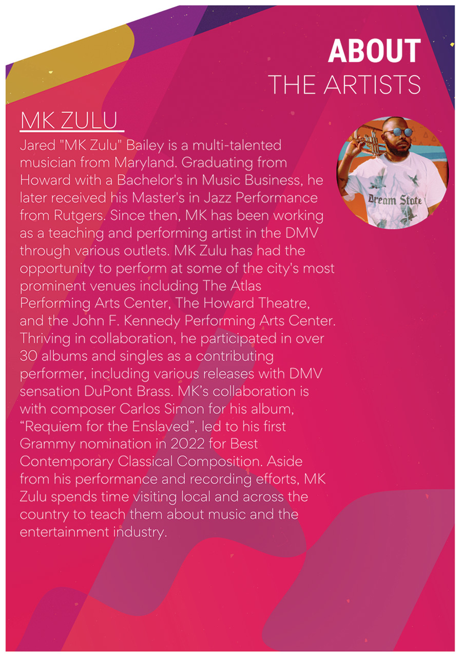 Comprised of both professional and community orchestra musicians, The Accord Symphony Orchestra, now in its 9th season, is dedicated to bringing world-class music to the community, fostering cultural enrichment and accessibility. In addition to classical music, the ensemble has also performed GoGo, jazz, sacred music, and music by living and/or underrepresented composers. Their commitment is evident through their performances at prestigious venues, including the embassies of Spain, Great Britain, and France, where they have shared their artistry with a wide array of audiences. In the 2023-2024 season, the orchestra made its highly anticipated debut at the Kennedy Center, further solidifying Accord Symphony’s role as an ambassador in itself of music and culture.