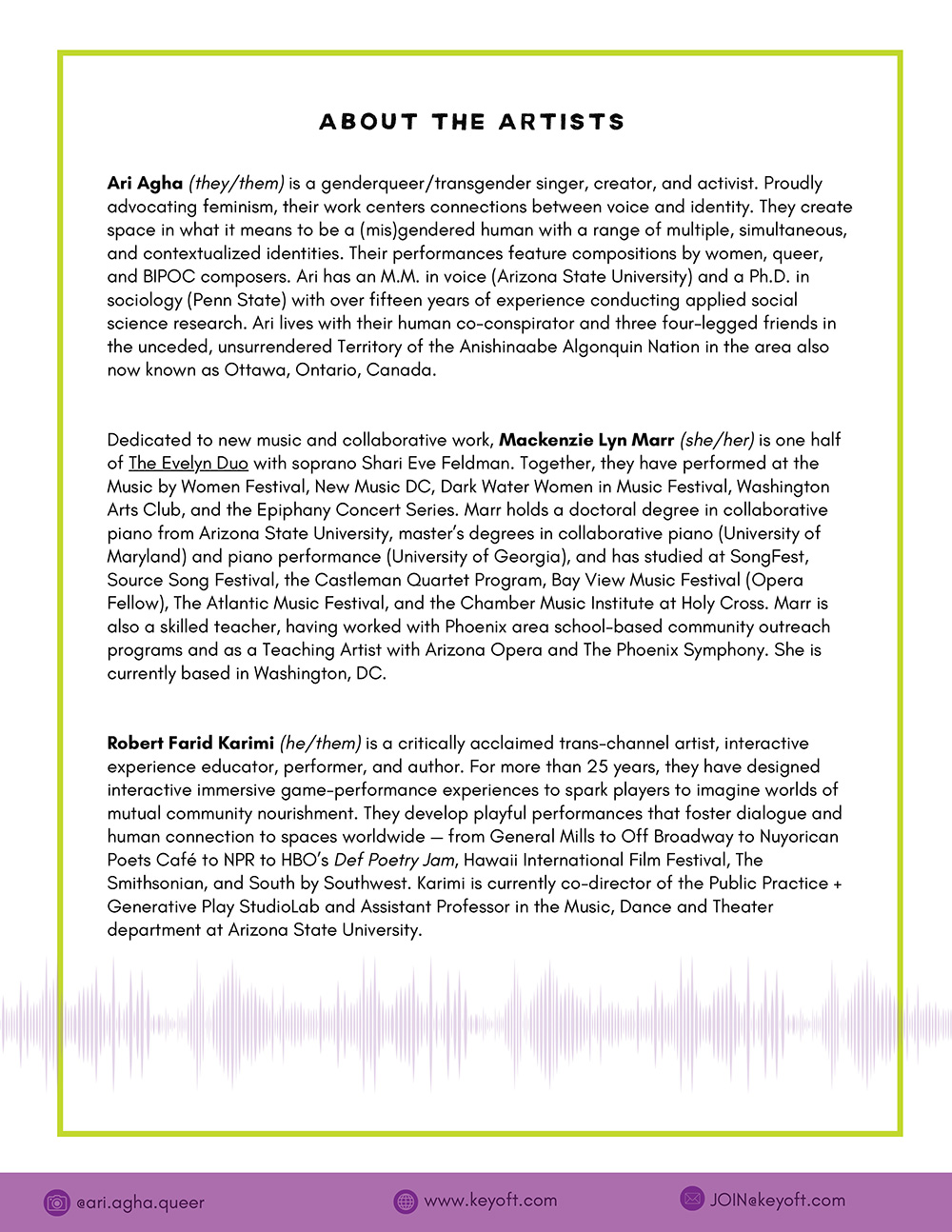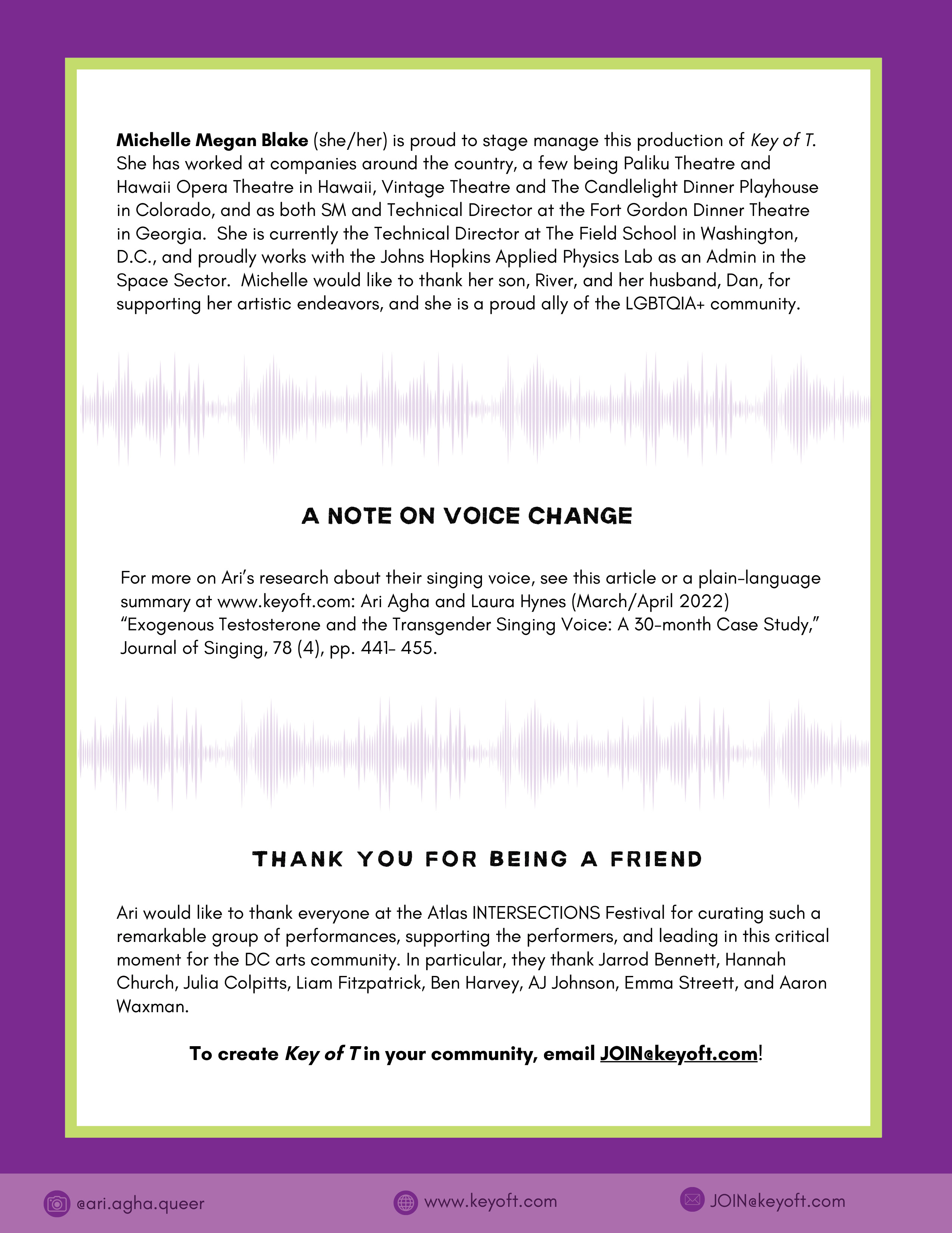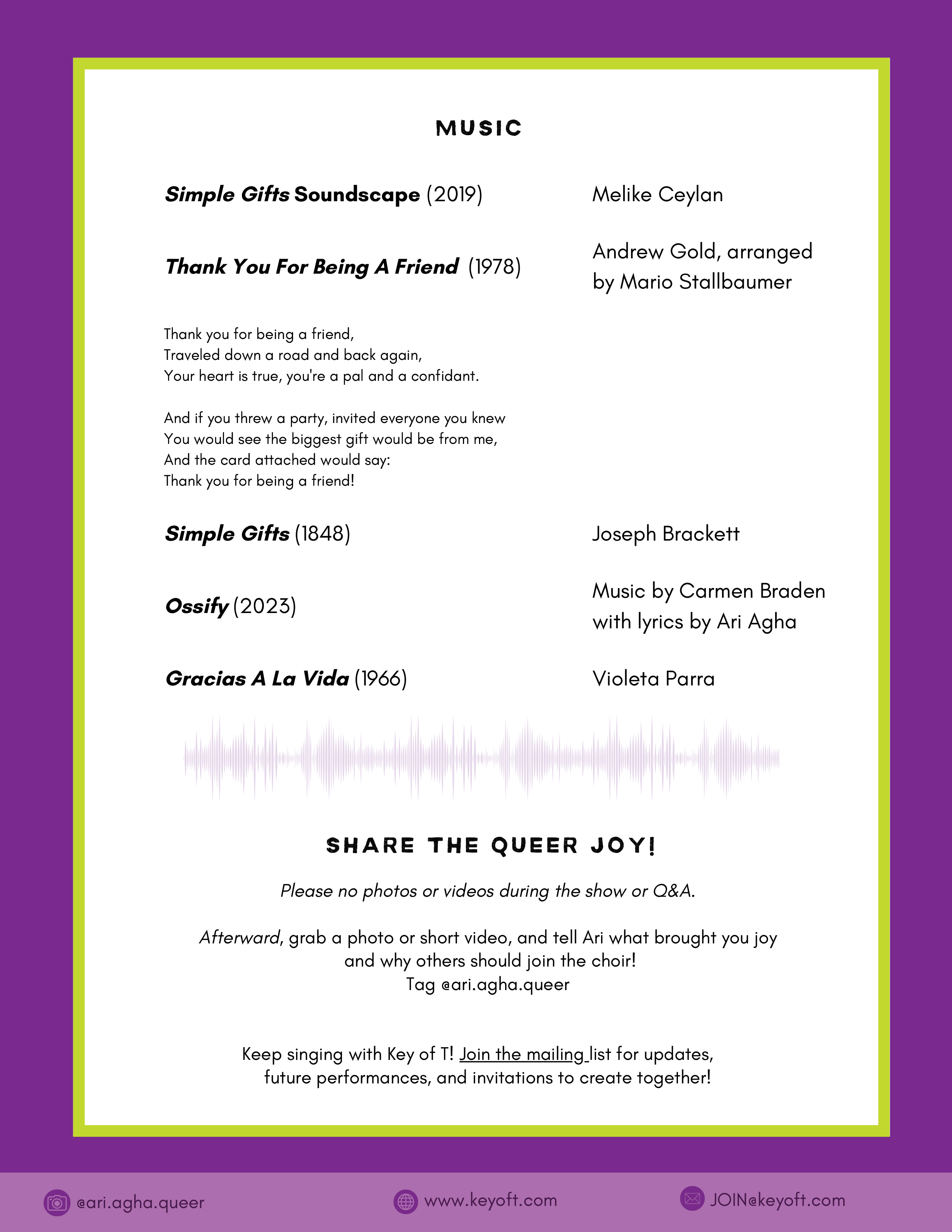 An interactive music/theater performance sharing transgender singer Ari’s voice transformation with testosterone. Join us to hear yourself anew and be part of the choir!