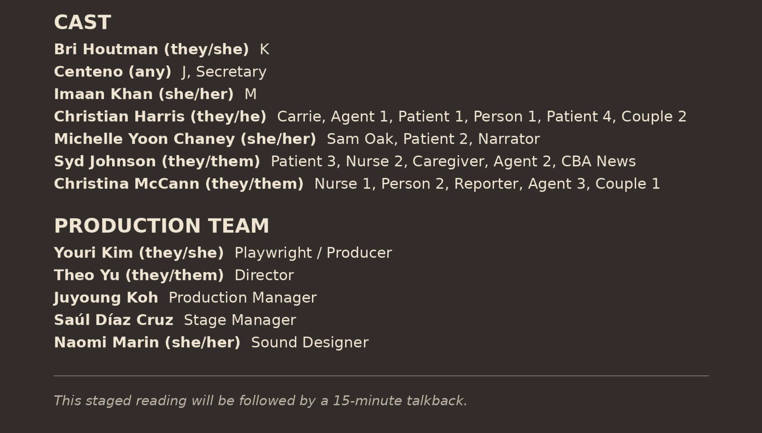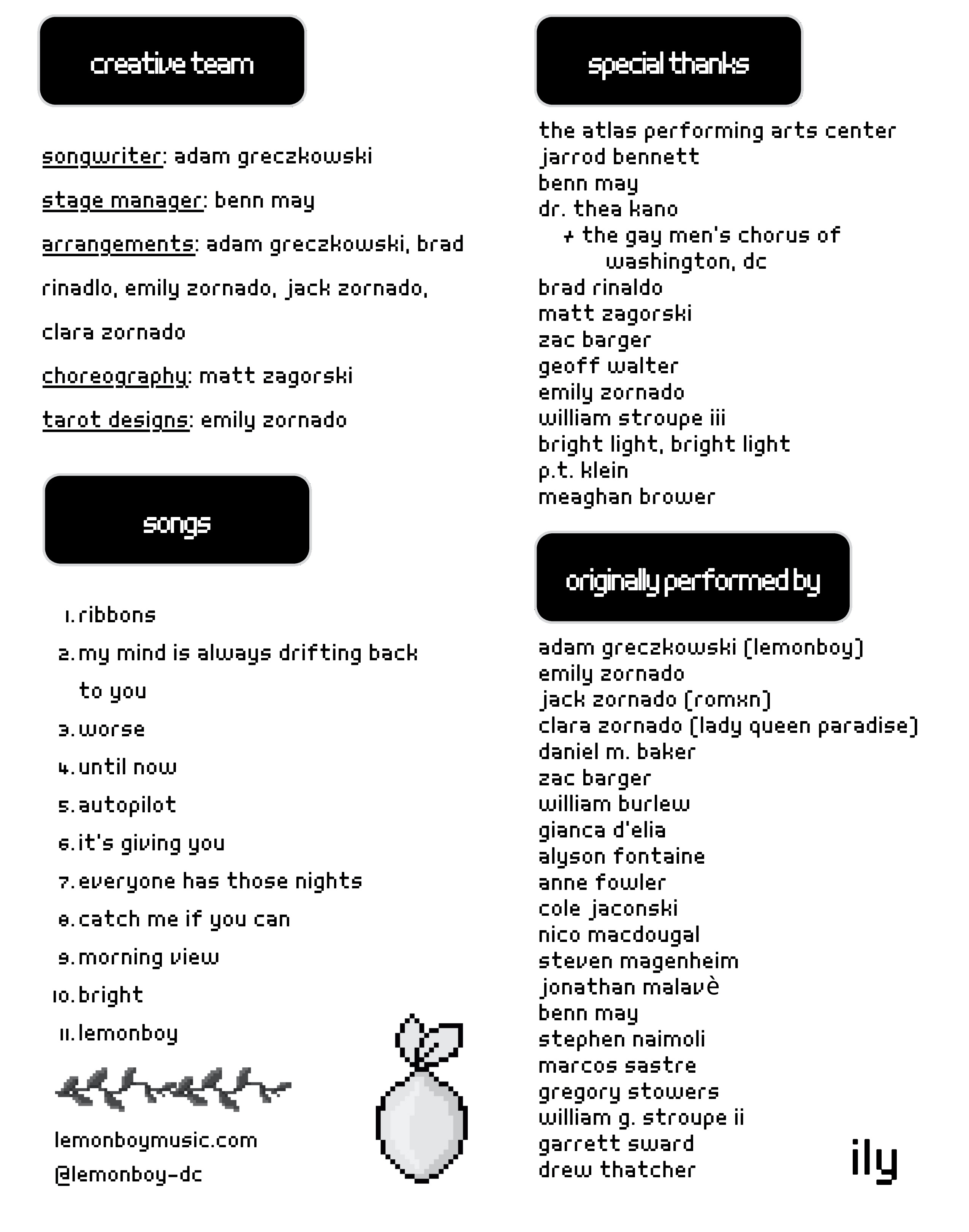 A vulnerable, autobiographical song cycle reflecting on self-discovery, grief, and compassion, blending personal reflections with the voices of chosen family in an intimate, collaborative performance.
