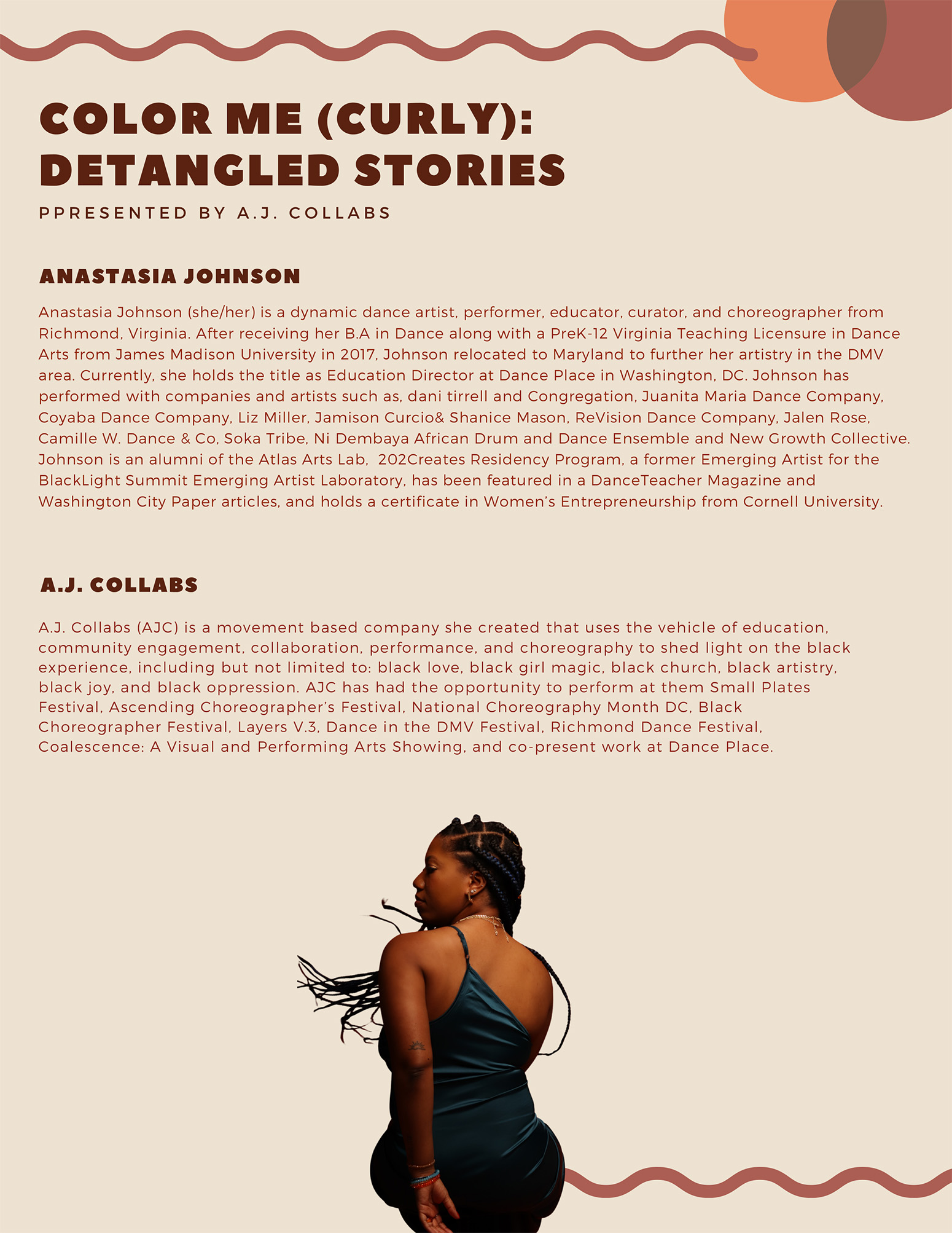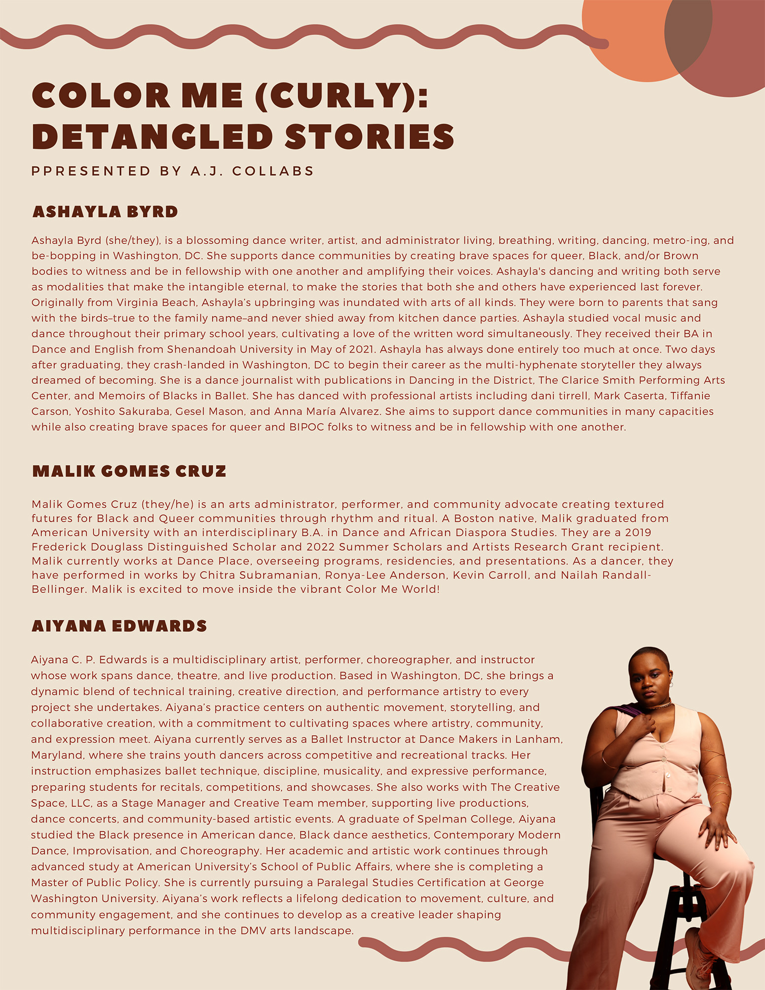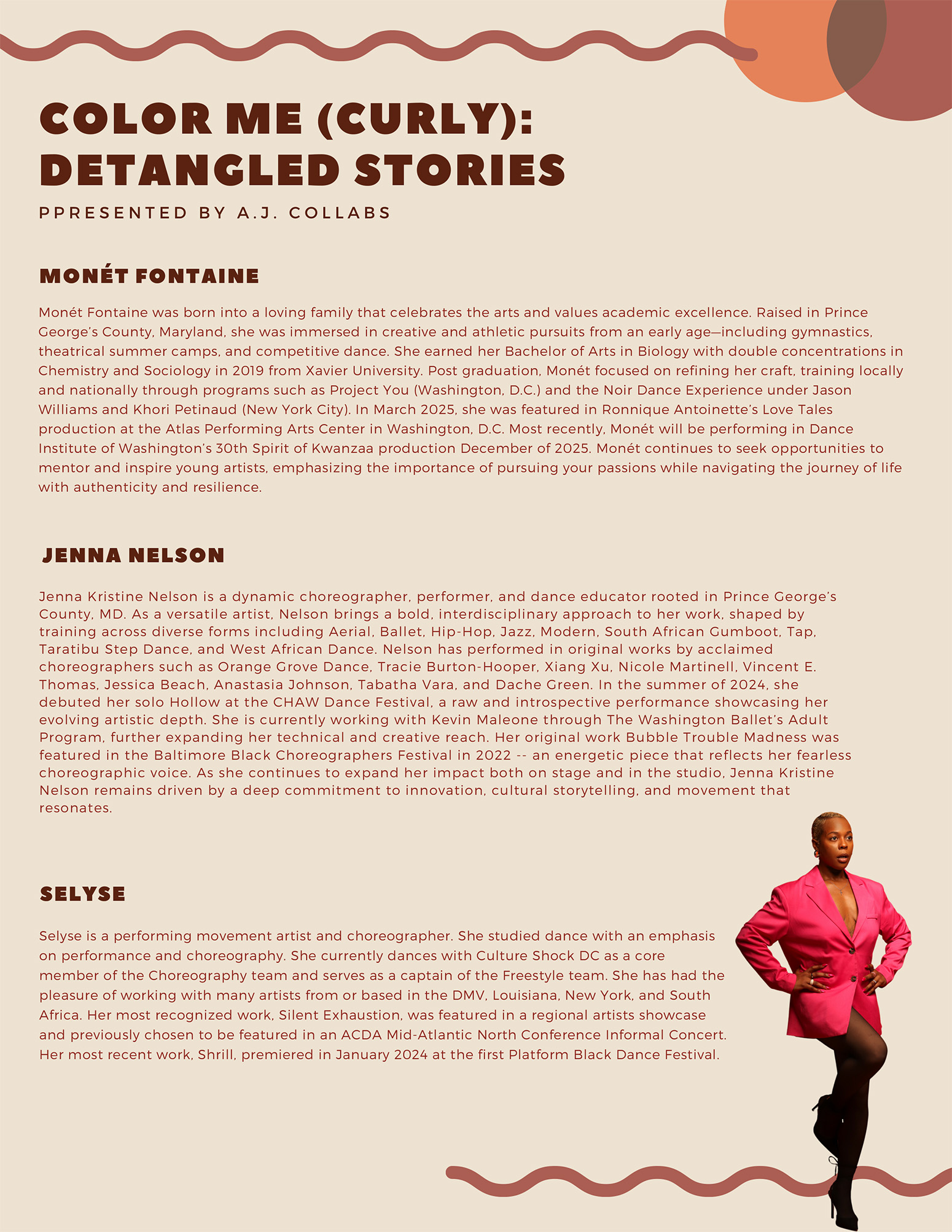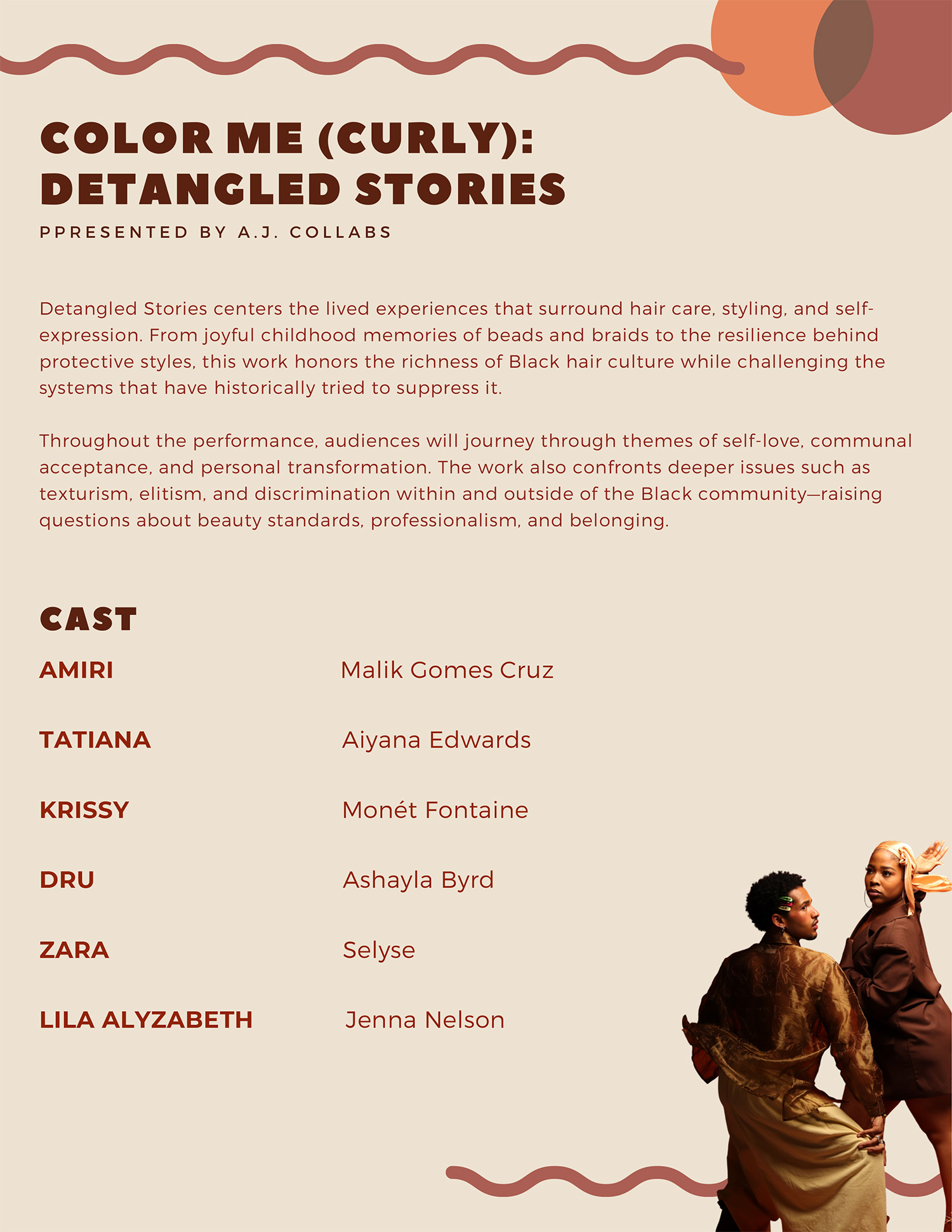 A multidisciplinary performance using movement, voice, and sound to explore Black hair’s cultural, emotional, celebrating identity, challenging bias, and honoring history, resilience, and self-love.