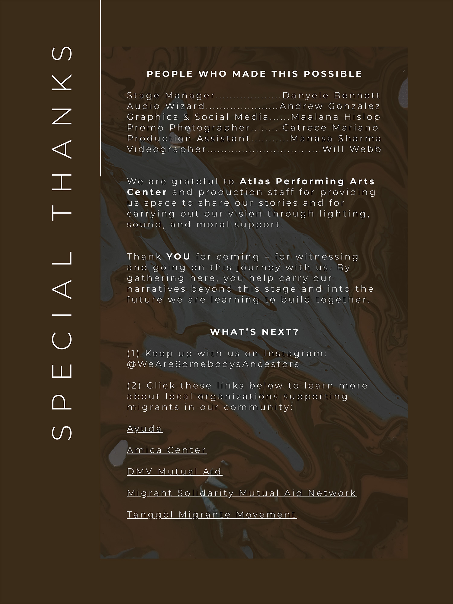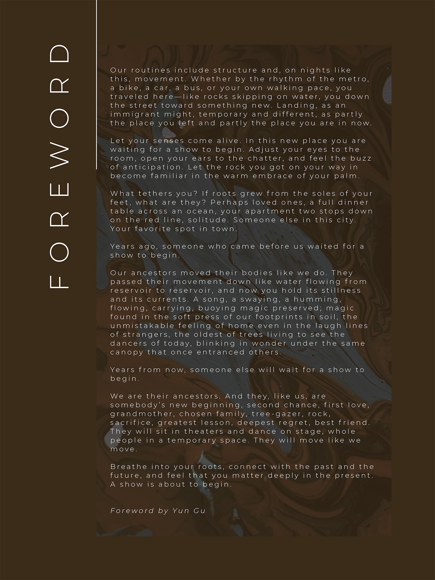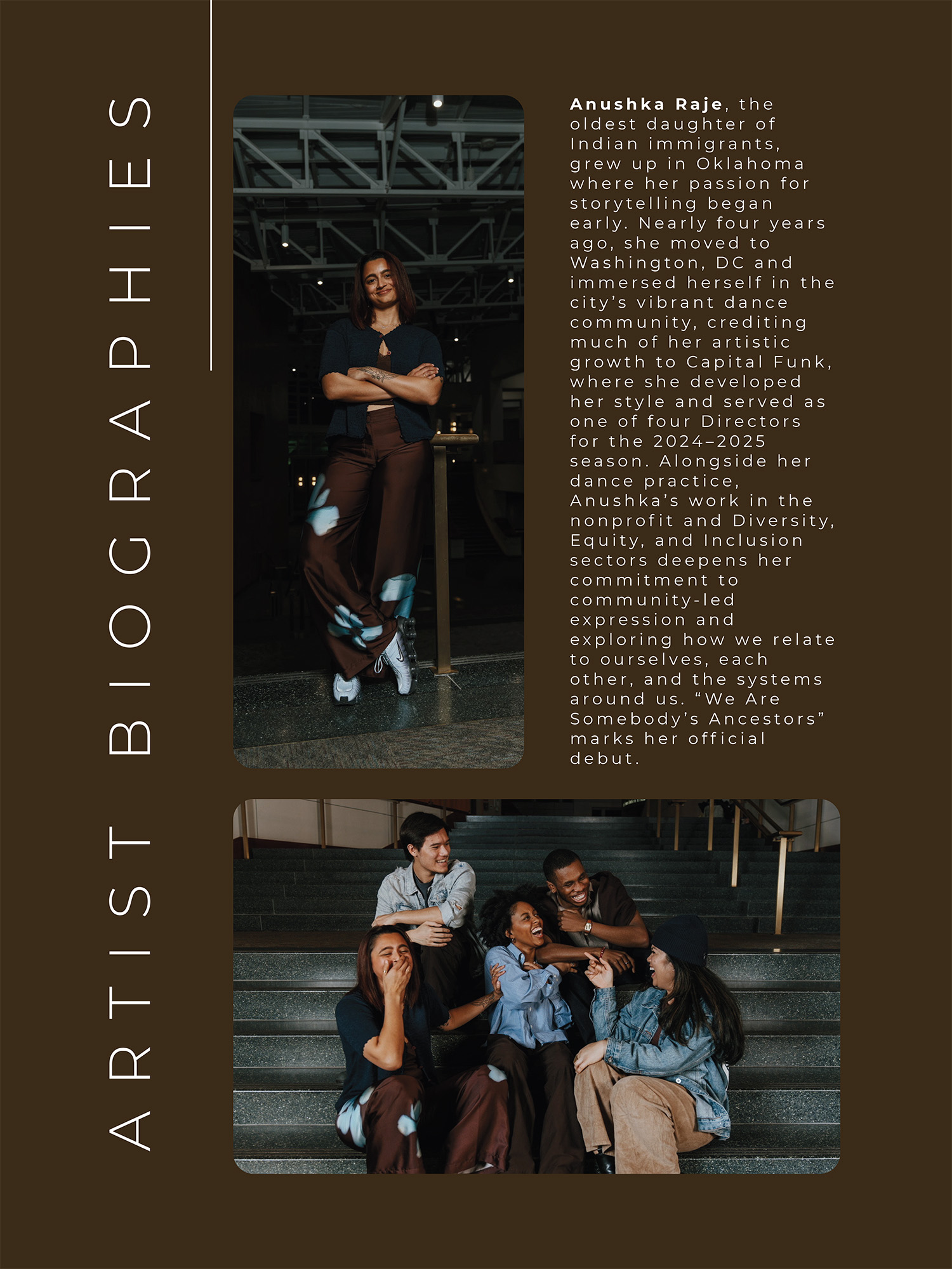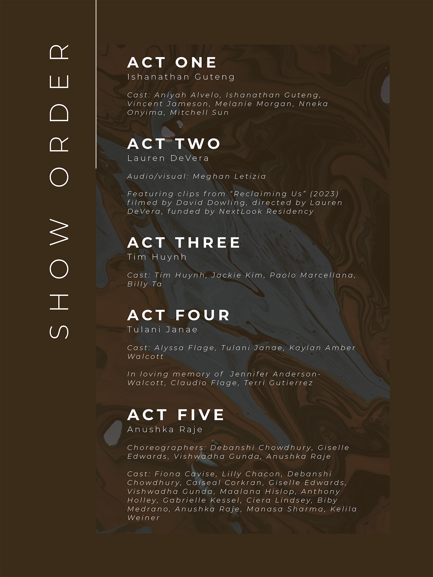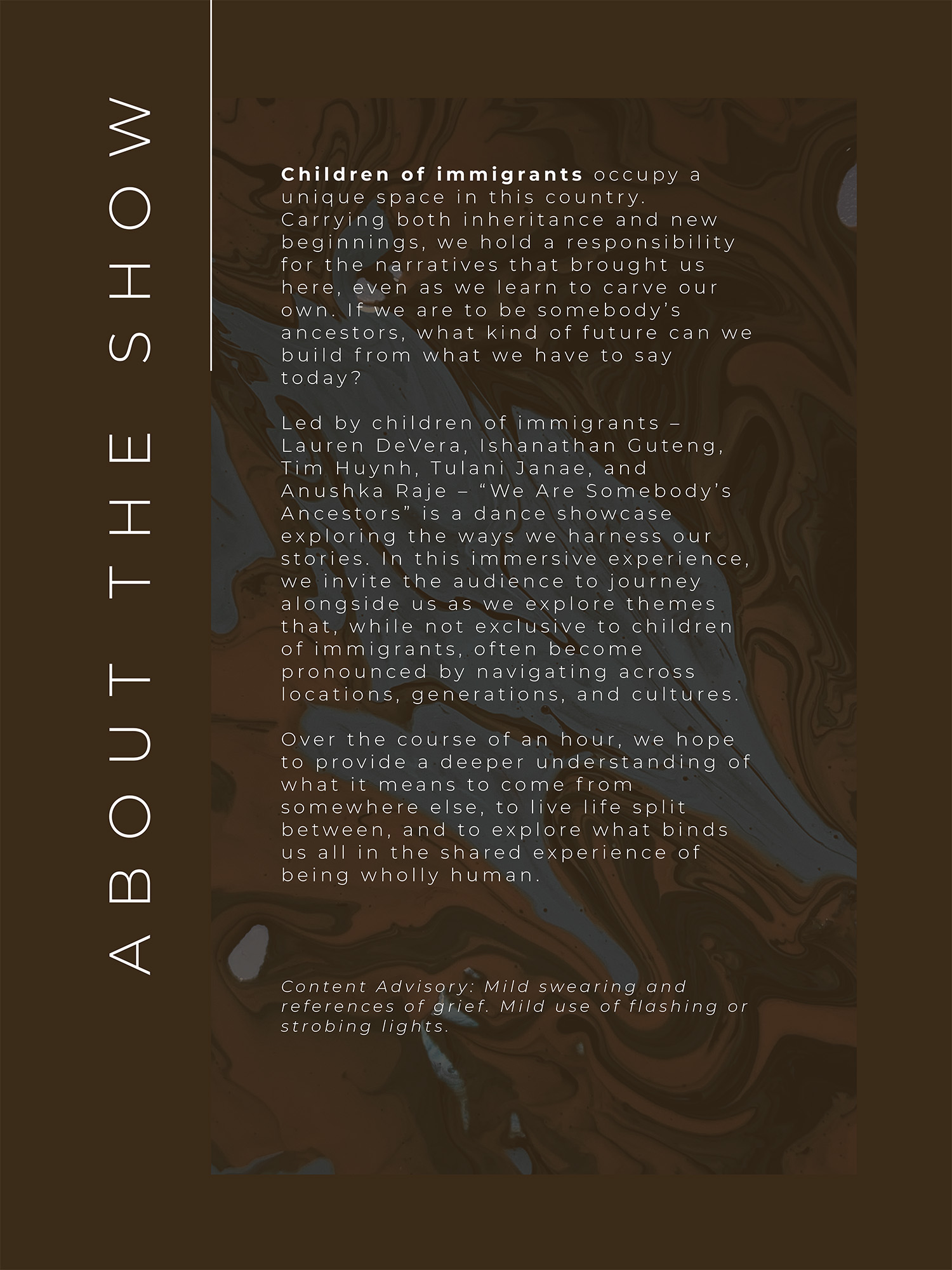 Children of immigrants lead “We Are Somebody’s Ancestors,” a dance showcase exploring inheritance and the ways we harness our own stories. Choreography by Lauren DeVera, Ishanathan Guteng, Tim Huynh, Tulani Janae, and Anushka Raje.