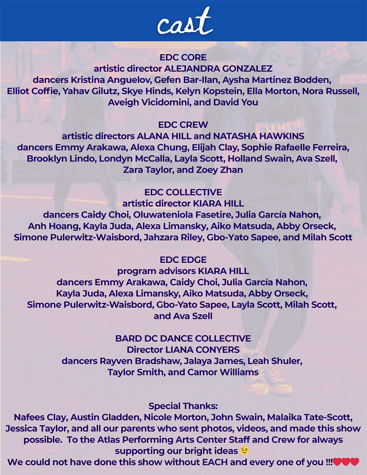 Heartfelt thanks to: Keri Joi Taylor and Laurice Chow at Maryland Youth Ballet, Etta Hulcher at Dance Loft on 14, Selena Figgins at Dance Exchange and Enoch Chan at Enoch Chan Productions & Photography, LLC.