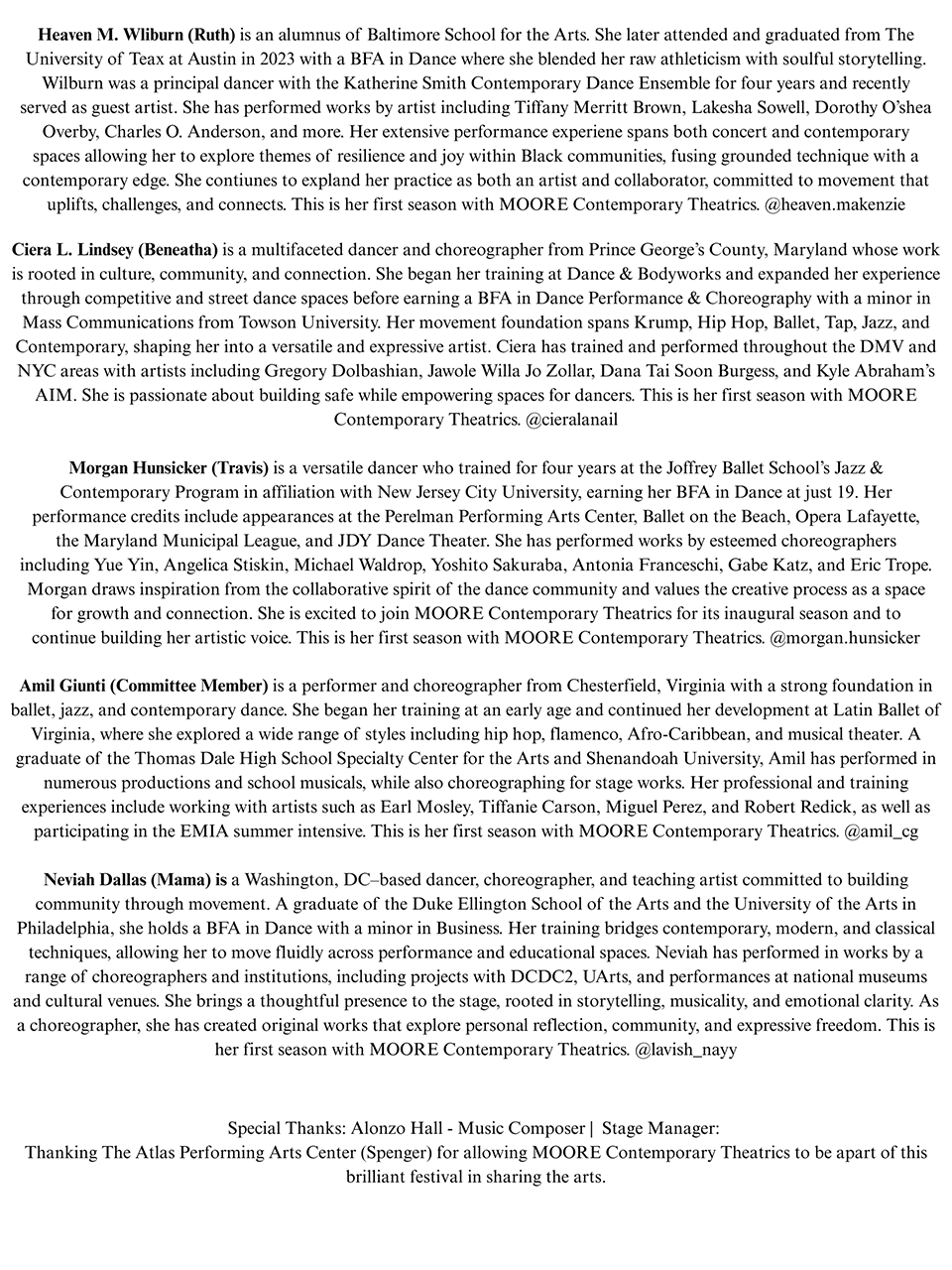 A kinetic portrait of New York CityÑits subways, streets, noise, rhythms, and restless energy. Dancers move through the cityÕs daily realities: crowded commutes, constant sound, living with friends and strangers in the tiny apartment, and the collision of cultures and languages. Shifting between grit and beauty, exhaustion and resilience, the work captures the chaos, pulse, and lived intensity that shape how New Yorkers survive, adapt, and keep moving.