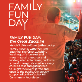 Family Fun Day with the Great Zucchini! The Great Zucchini, Washington’s funniest and most magical preschool and kindergarten entertainer, performs a colorful magic show where every child is a star and guaranteed to laugh! This event is free and open to the public. Generously supported by the Capitol Hill Community Foundation.