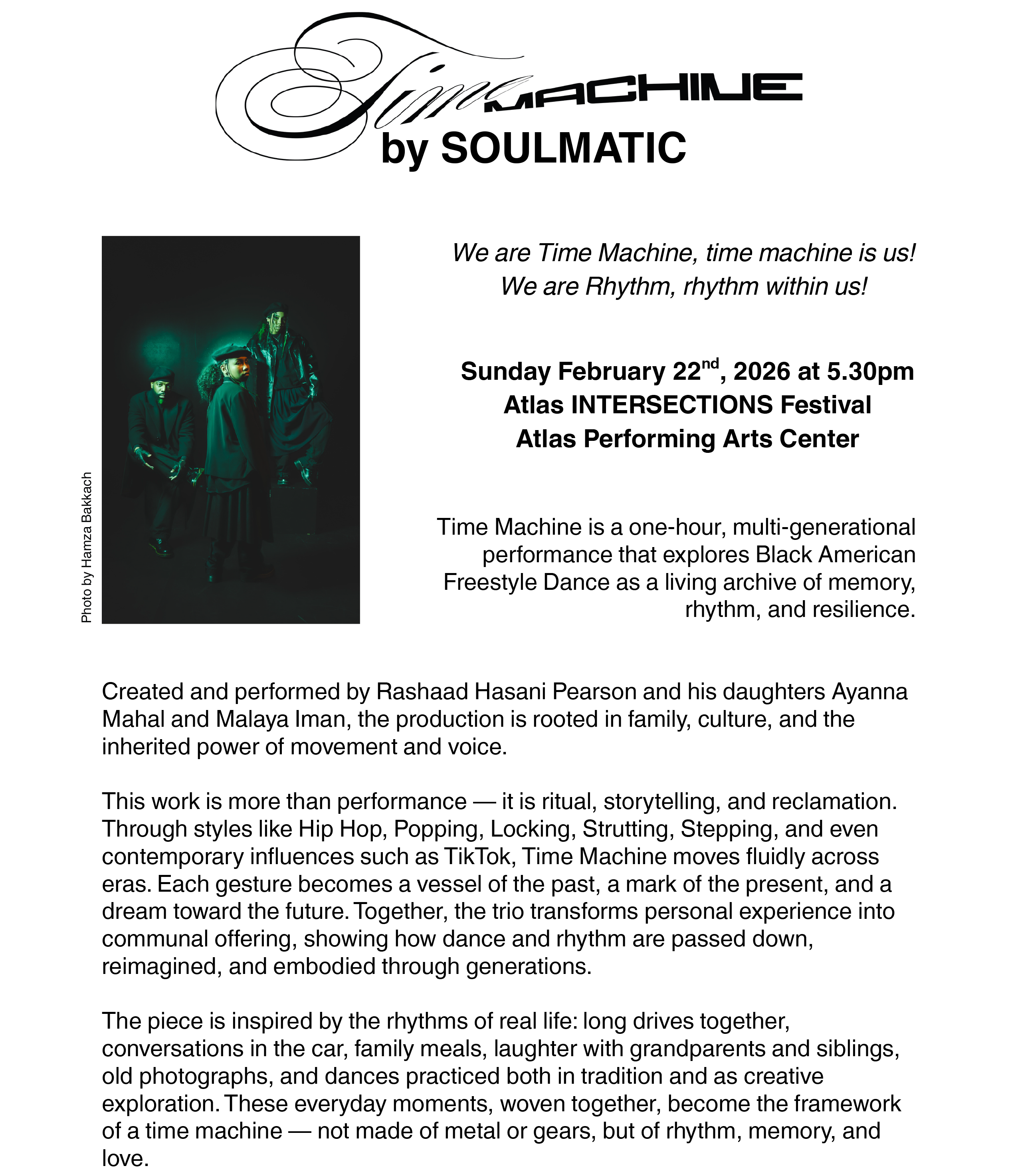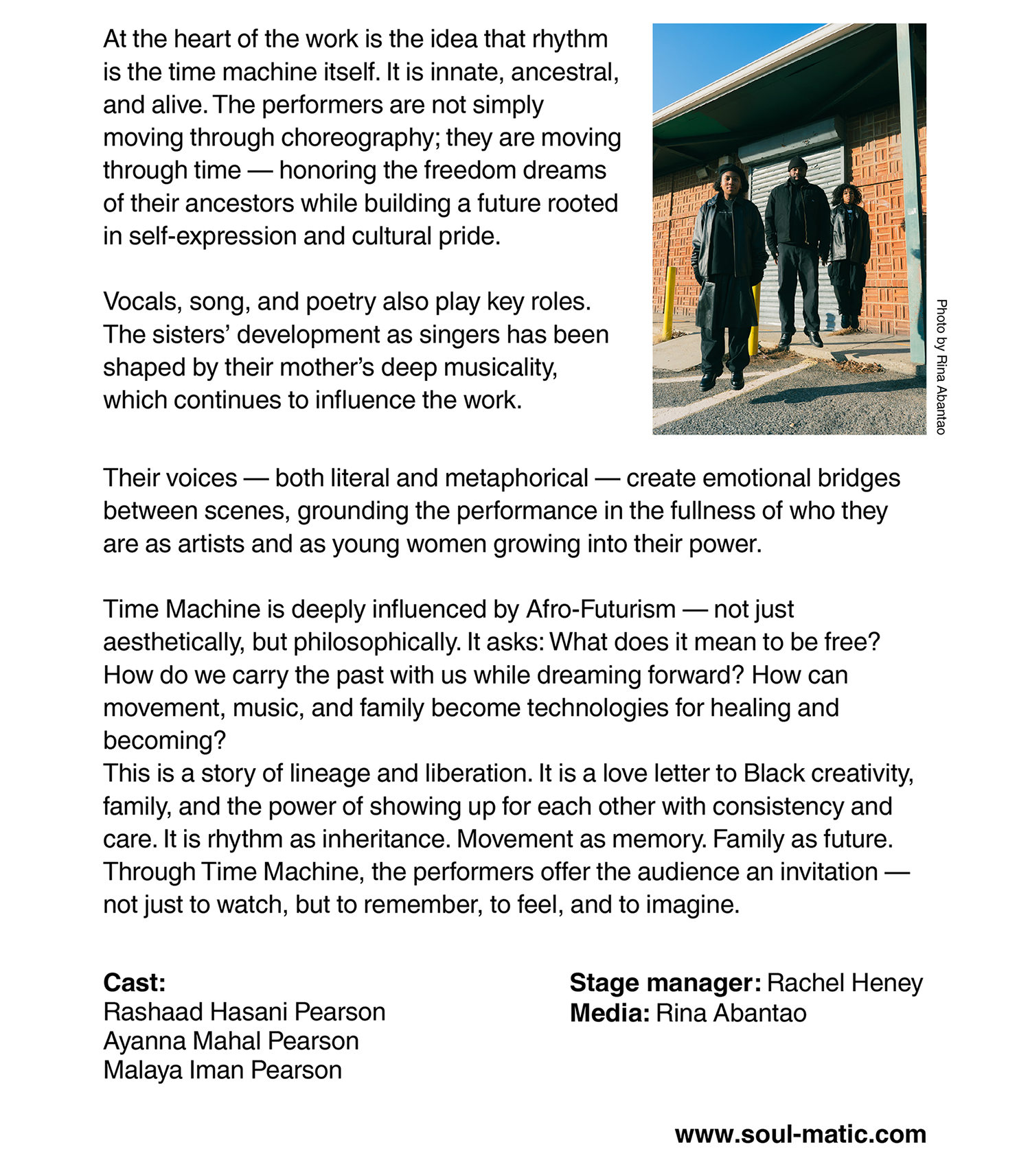 Time Machine is a family performance honoring Black American freestyle dance, rhythm, and legacy through storytelling, movement, and the shared journey across generations.