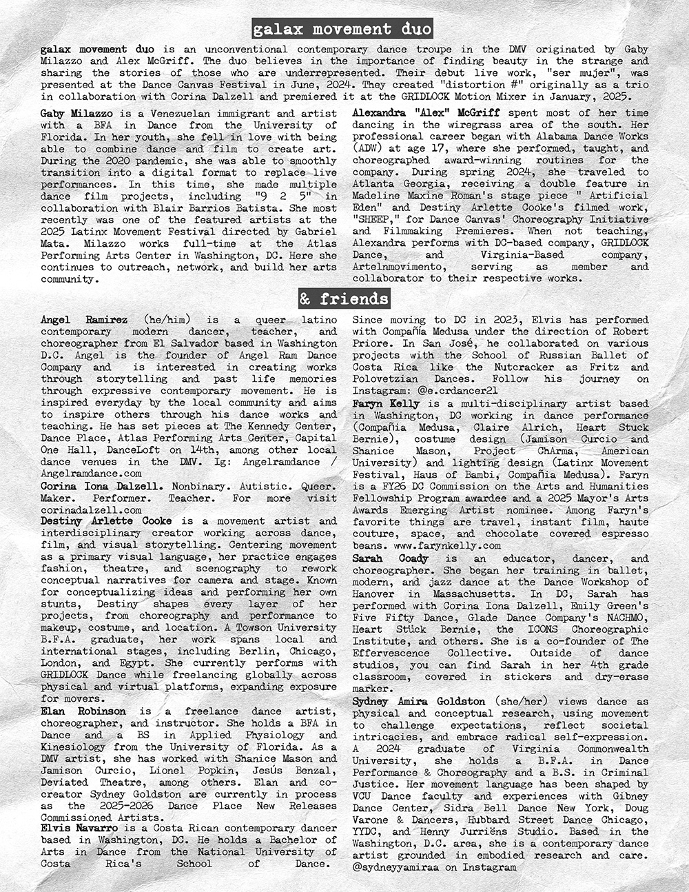 galax movement duo invites you to an evening of dance and film featuring other members of the DMV dance community! For one night only, experience the different relationships of humanity through movement and art.