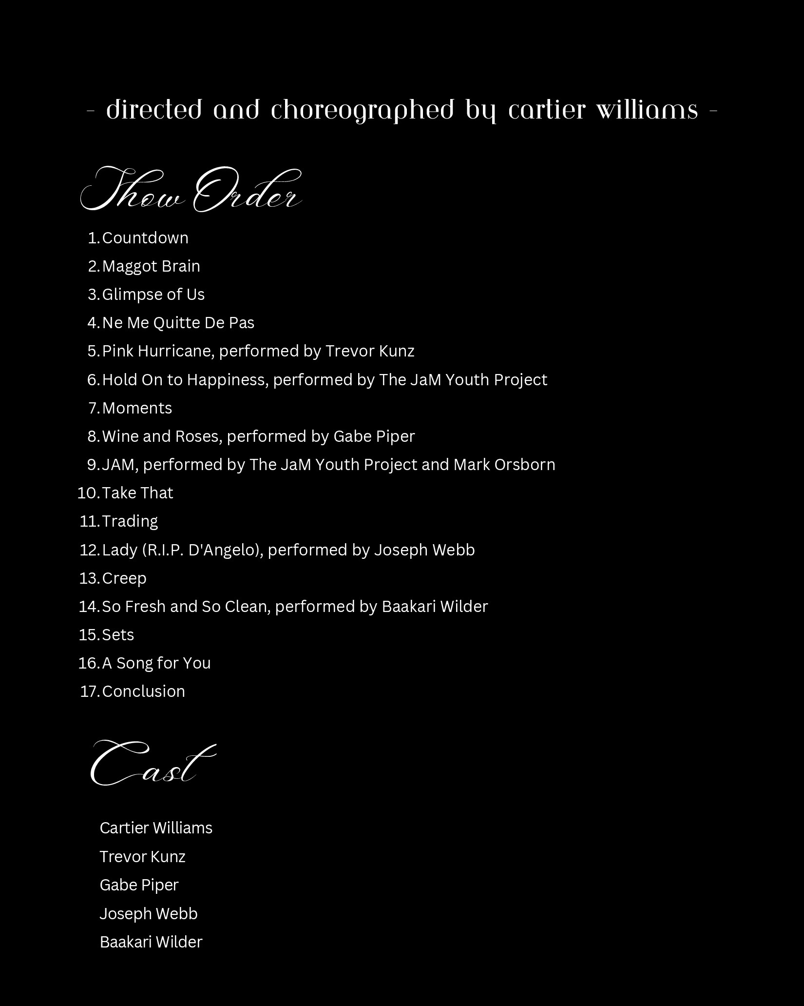 Dancers: Lauren Cammack, Zoey Jae Collins, Casey Hart, Simone Pair, Blake Payne, Chloe Payne, Selah Quinn, Alanna Rivas-Rogers, Kami Rivas-Rogers, Khaleel Smith, Salaam Willaims