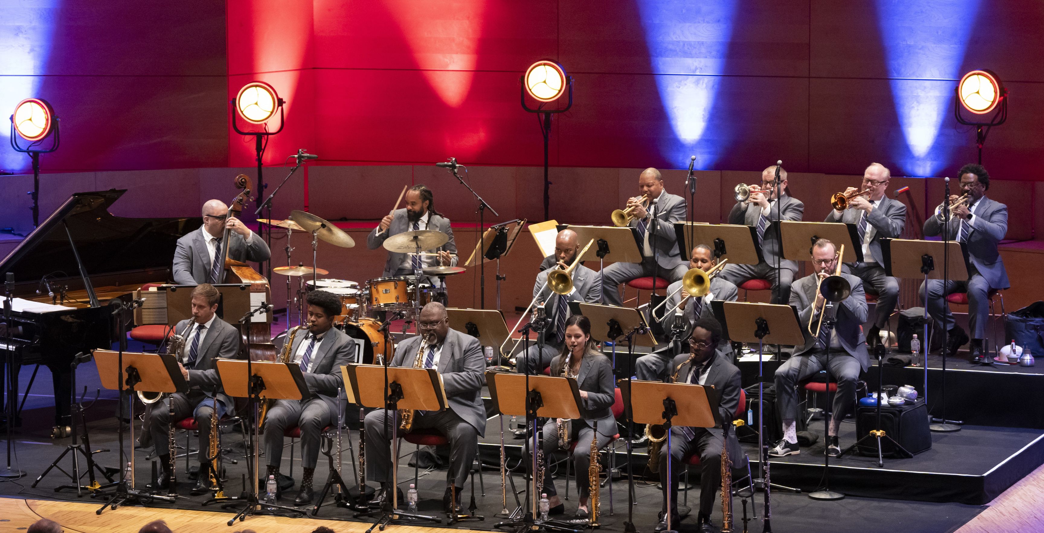 The Jazz at Lincoln Center Orchestra (JLCO), comprising 15 of the finest jazz soloists and ensemble players today, has been the Jazz at Lincoln Center resident orchestra since 1988 and spends over a third of the year on tour across the world. Featured in all aspects of Jazz at Lincoln Center’s programming, this remarkably versatile orchestra performs and leads educational events in New York, across the U.S. and around the globe; in concert halls; dance venues; jazz clubs; public parks; and with symphony orchestras; ballet troupes; local students; and an ever-expanding roster of guest artists. Under Music Director Wynton Marsalis, the Jazz at Lincoln Center Orchestra performs a vast repertoire, from rare historic compositions to Jazz at Lincoln Center-commissioned works, including compositions and arrangements by Duke Ellington, Count Basie, Fletcher Henderson, Thelonious Monk, Mary Lou Williams, Dizzy Gillespie, Benny Goodman, Charles Mingus, and current and former Jazz at Lincoln Center Orchestra members Wynton Marsalis, Wycliffe Gordon, Ted Nash, Victor Goines, Sherman Irby, Chris Crenshaw, and Carlos Henriquez.