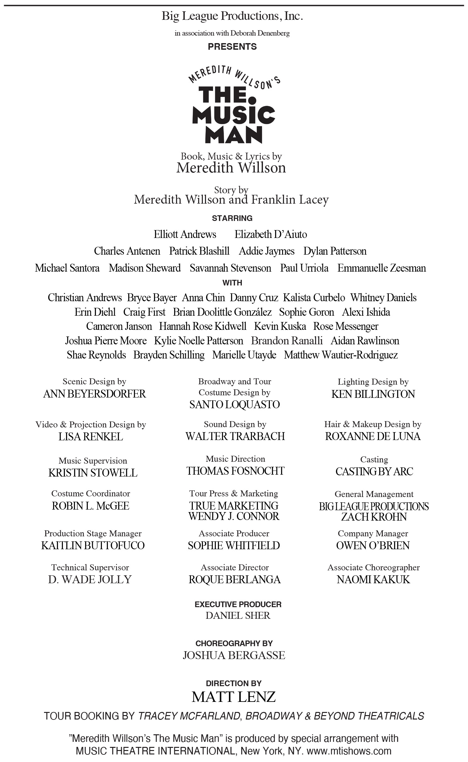 WHITNEY DANIELS, ALEXI ISHIDA; for Marcellus Washburn—CRAIG FIRST, KEVIN KUSKA; for Mayor Shinn—KEVIN KUSKA, JOSHUA PIERRE MOORE; for Winthrop Paroo & Amaryllis—KYLIE NOELLE PATTERSON; for Eulalie Mackecknie Shinn— HANNAH ROSE KIDWELL, ROSE MESSENGER; for Mrs. Paroo— HANNAH ROSE KIDWELL, ROSE MESSENGER; for Charlie Cowell— BRIAN DOOLITTLE GONZÁLEZ, CRAIG FIRST; for Tommy Djilas— DANNY CRUZ, AIDAN RAWLINSON; for Zaneeta Shinn— KALISTA CURBELO, MARIELLE UTAYDE; for Gracie Shinn — MARIELLE UTAYDE; for Olin Britt — CHRISTIAN ANDREWS; for Ewart Dunlop, Oliver Hix, Jacey Squires — KEVIN KUSKA; for Maud Dunlop, Alma Hix, Mrs. Squires, Ethel Toffelmeir —SOPHIE GORON
