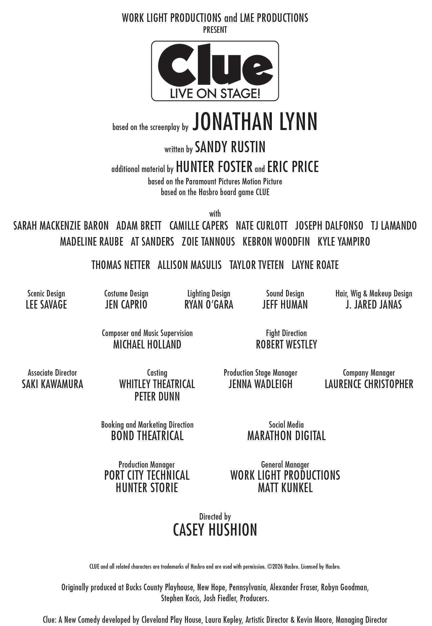 CASEY HUSHION (Director). Broadway: Associate Director of Mean Girls, Aladdin, The Prom, In The Heights, Elf, The Drowsy Chaperone, To Be Or Not to Be and Good Vibrations. New York credits include Call Me Madam (Encores), Fat Camp and Nerds (almost). Before launching the national tour of Clue, Casey directed the premiere at Cleveland Playhouse, as well as productions at la Mirada Theatre and Paper Mill Playhouse. Also at Paper Mill, she has directed Murder On The Orient Express, A Jolly Holiday, Beehive and Beautiful. Most recently, Casey helmed the National Tour of The Cher Show and the new musical Mystic Pizza. Casey served as Artistic Director of North Carolina Theatre for ten years. For television, Casey has choreographed episodes of “Unbreakable Kimmy Schmidt.” Love to Marc and her three kids, Lincoln, Violet and Jane.