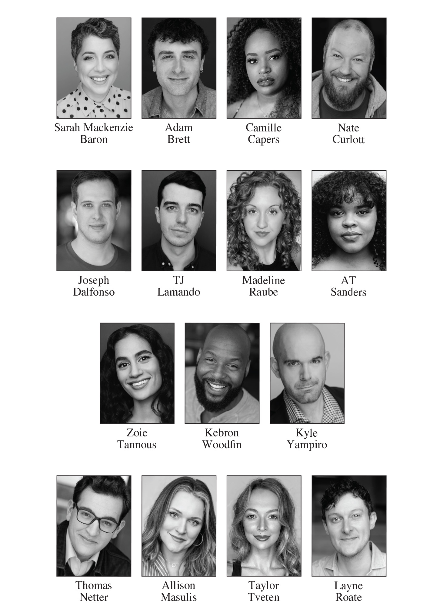 For Colonel Mustard—JOSEPH DALFONSO, KEBRON WOODFIN; For Wadsworth, Mr. Green, Professor Plum, Mr. Boddy (and others), The Cop (and others)—THOMAS NETTER, LAYNE ROATE; For Mrs. Peacock, Mrs. White, Yvette, Miss Scarlet, The Cook (and others)—ALLISON MASULIS, TAYLOR TVETEN.