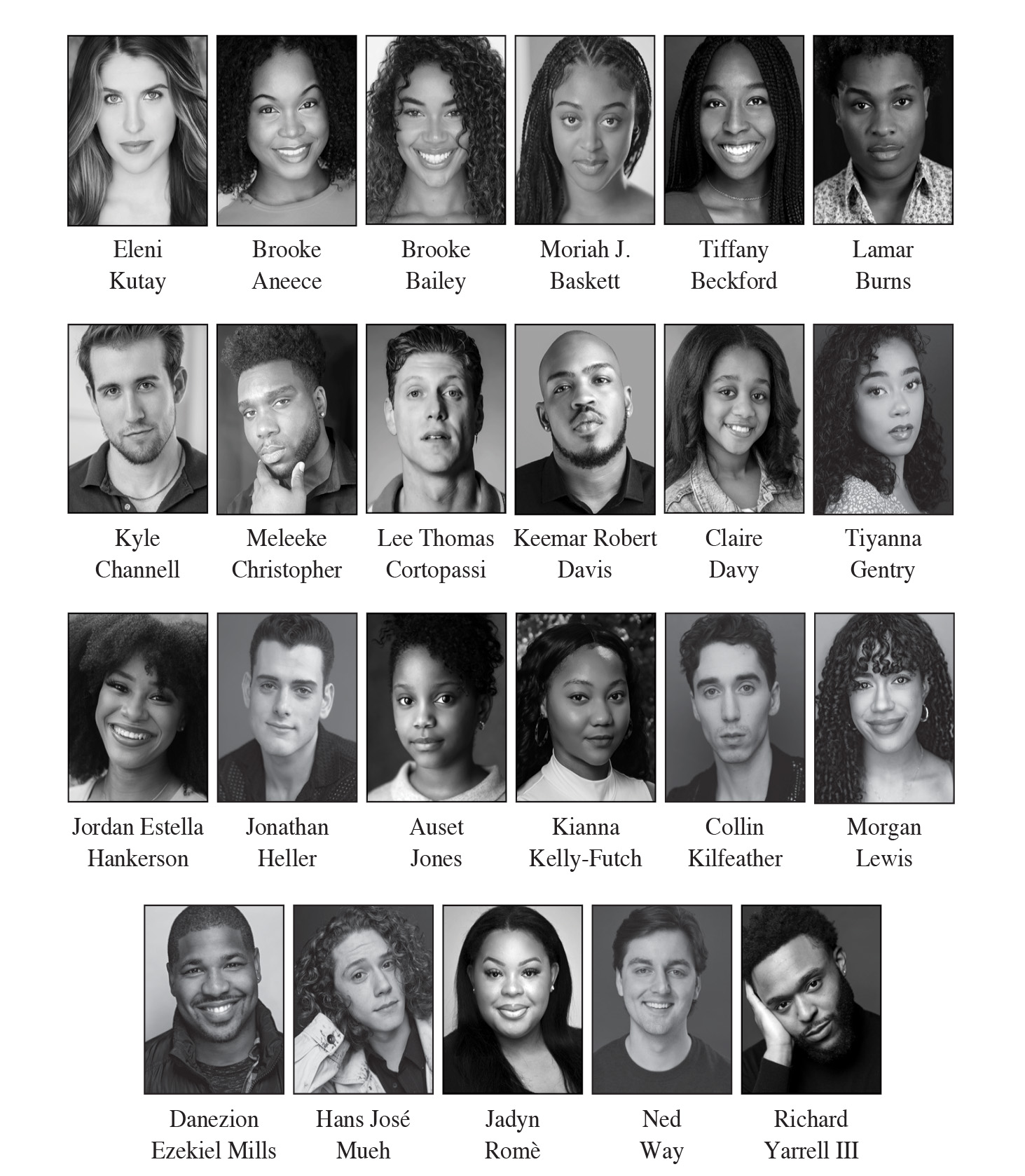 For Tina—BROOKE BAILEY, TIYANNA GENTRY; for Ike—MELEEKE CHRISTOPHER, DANEZION EZEKIEL MILLS, RICHARD YARRELL III; for Zelma—KIANNA KELLY-FUTCH, JADYN ROMÈ; for Gran Georgeanna—JADYN ROMÈ; for Raymond– MELEEKE CHRISTOPHER, RICHARD YARRELL III; for Richard– MELEEKE CHRISTOPHER, RICHARD YARRELL III; for Young Anna Mae—JORDAN ESTELLA HANKERSON; for Young Alline—TIFFANY BECKFORD, JORDAN ESTELLA HANKERSON, MORGAN LEWIS; for Rhonda—TIFFANY BECKFORD, MORGAN LEWIS.