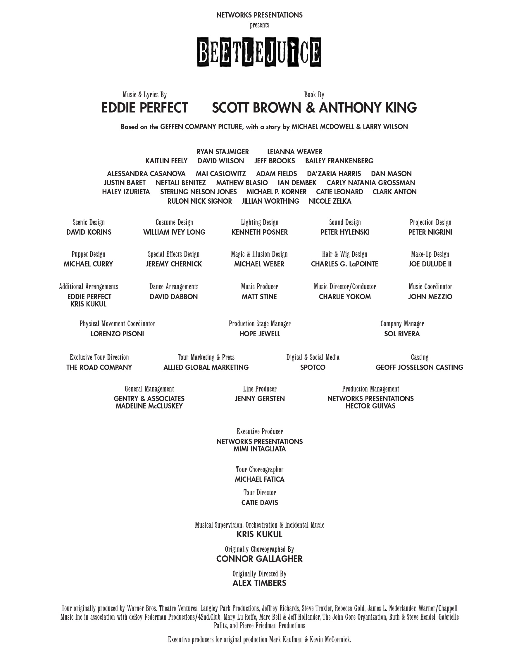 NICOLE ZELKA (Swing, u/s Barbara, u/s Delia, u/s Maxine Dean, u/s Juno, u/s Miss Argentina). Stoked to be back on the road and joining the Netherworld! National tours: Rodgers & Hammerstein’s Cinderella, Charlie and the Chocolate Factory, Elf. Thank you to Connor, Catie, and the entire Beetlejuice and NETworks family. Love to my people — for Mommy & Taylor. Everything happens for a reason! @nicolezelka