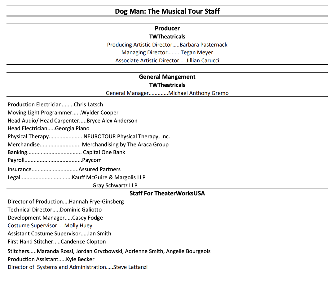 ZOE PARASKEVOPOULOS (Assistant Stage Manager) Zoe is originally from DFW and is happy to be back with TheaterWorksUSA this year! Zoe graduated from the University of Evansville with a BS in Stage Management and has worked between NYC and DFW since then. Previous TWUSA credits include Cat Kid Comic Club and The Magic School Bus. Other favorite stage management credits include: King Kirby (American Chronicles Theatre Co.), Noises Off (UE Theatre), Drowsy Chaperone (The Hopeful Theatre Project), and Best Christmas Pageant Ever (Casa Mañana). Zoe is excited to be a part of the Dog Man company and hopes you have fun at the show!
