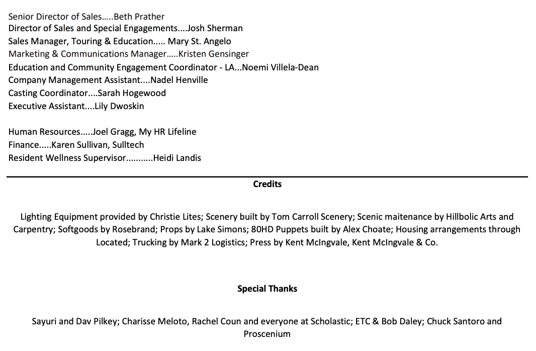 TW THEATRICALS/ THEATERWORKSUSA (Barbara Pasternack, Producing Artistic Director; Tegan Meyer, Managing Director) TWTheatricals is a new division of TheaterWorksUSA dedicated to creating fully produced, full-length works for multigenerational audiences. TheaterWorksUSA has led the Theater for Young and Family Audiences movement in New York City and across North America for over half a century. TWUSA believes that access to art—and theater, in particular—is vital. Since 1967, the 501(c)3 not-for-profit has captured the imaginations of 100 million new and veteran theatergoers with an award- winning repertoire of over 140 original plays and musicals.