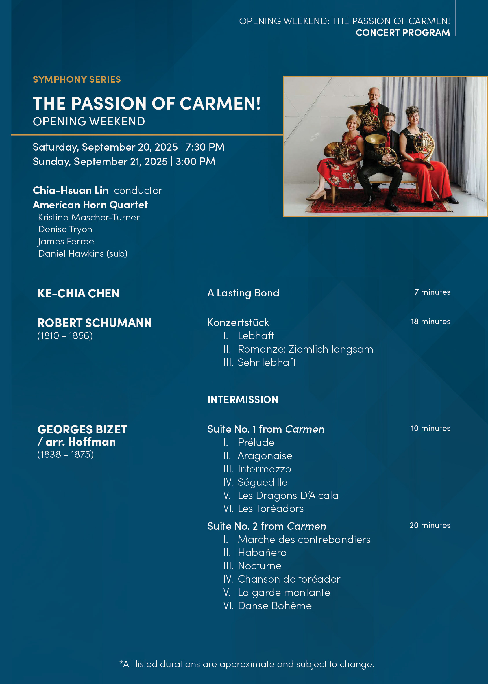 The Schumann Konzertstück, a unique concerto for four horns, places this heroic instrument at center stage. Framing it are two boldly expressive orchestral works: A Lasting Bond by Taiwanese composer Ke-Chia Chen and selections from Bizet’s Carmen – a score Lin is especially fond of, and one that offers the musicians a dazzling showcase of color and emotion.