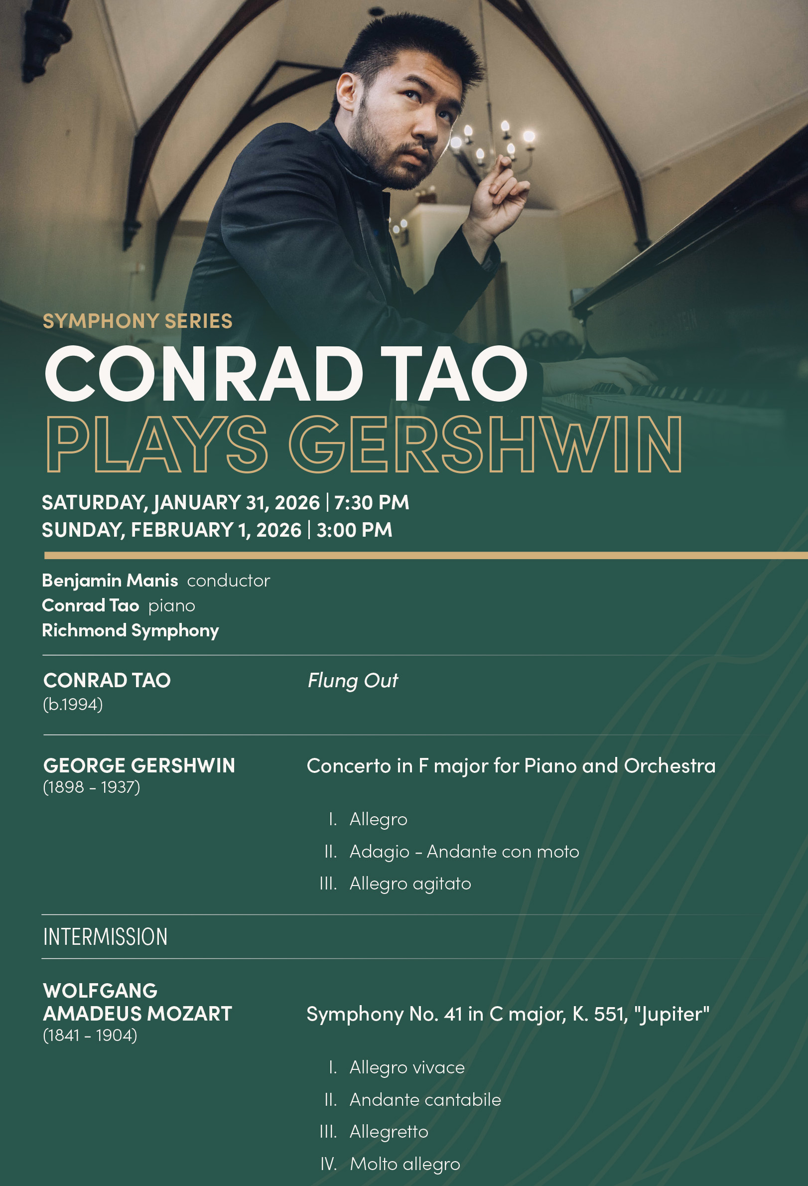 At 31, Conrad Tao has already carved out a singular place in American music – a pianist-composer whose boundary-defying imagination has made him one of the most compelling voices of his generation. Celebrated as both a brilliant interpreter of the classical repertoire and an adventurous creator of new work, Tao became a natural choice in 2024 when orchestras around the country marked the centenary of Rhapsody in Blue. Like Gershwin – who was only 25 when he shook up the musical world with that iconic score – Tao moves fluently among idioms and cultural lineages, composing and performing with the same restless creative curiosity.