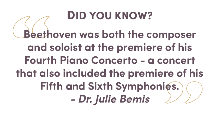 Beethoven’s opening gesture remains one of the boldest in any concerto: the piano begins alone, softly, almost as though thinking aloud. What seems spontaneous is tightly woven, introducing the subtle rhythmic cell that underlies the first movement. When the orchestra enters, it restates the idea in a different key, creating the gentle sensation that the music has shifted its footing — a tiny harmonic surprise that opens a world of possibility. Much of the movement’s drama grows from these understated changes of light and color rather than from overt confrontation.