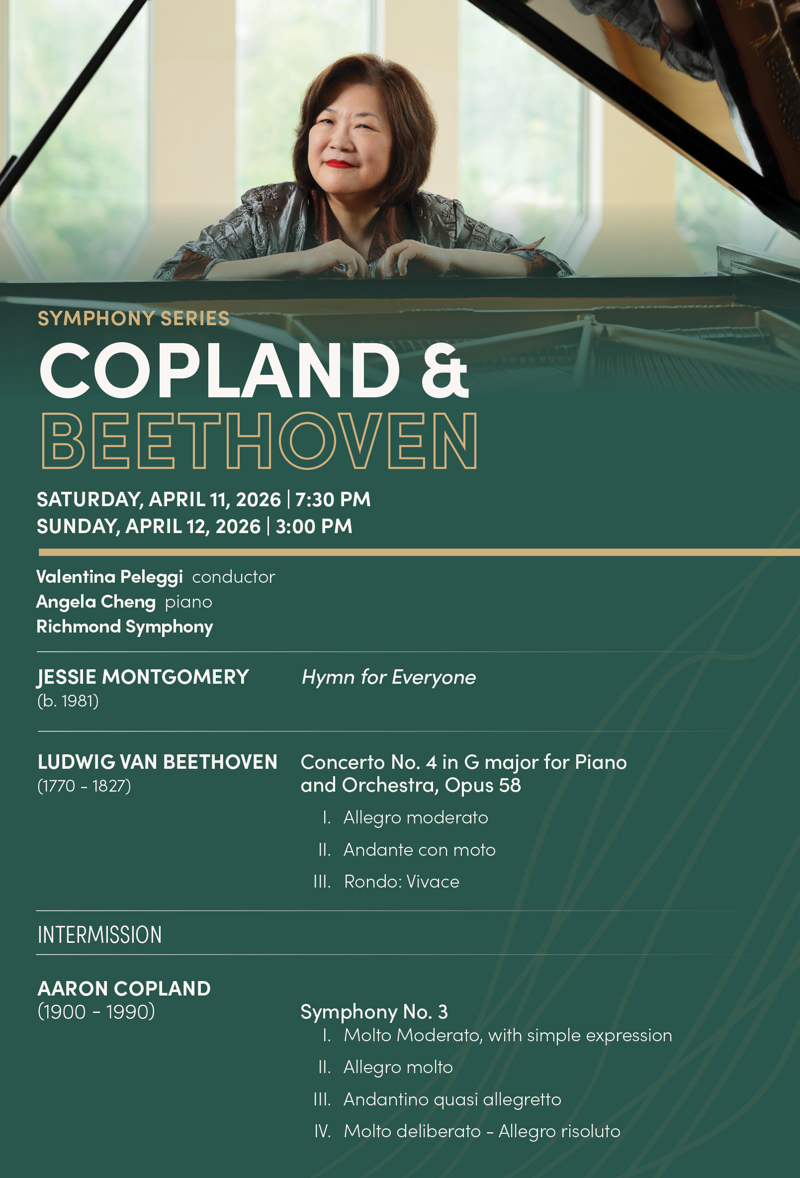 Montgomery’s Hymn for Everyone arose from a moment of personal and collective upheaval. Its blend of simplicity and spaciousness offered Peleggi a natural prelude to Beethoven’s most introspective concerto — music born in solitude yet reaching outward. The mood then expands toward the broader landscape of American orchestral sound with Copland’s Symphony No. 3.