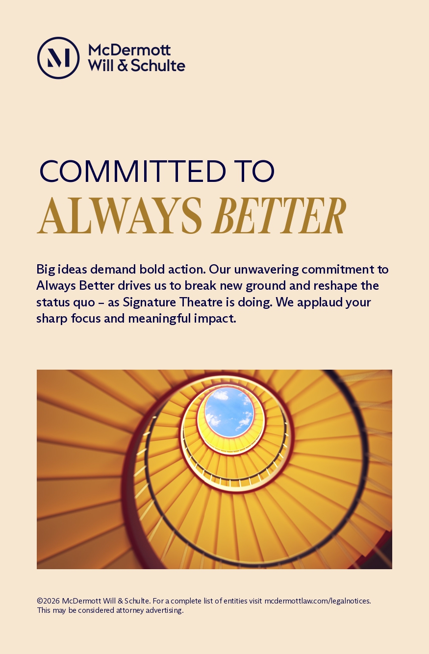 Signature Theatre is built on the unceded lands of Lenapehoking, homeland of the Lenape, which was colonized by European settlers starting in the 17th Century. We are a home for storytellers, and this acknowledgement is only a starting point in our commitment to building an inclusive community. As part of that commitment, we lift up playwrights and storytellers of all cultures, and welcome all audiences in our spaces.