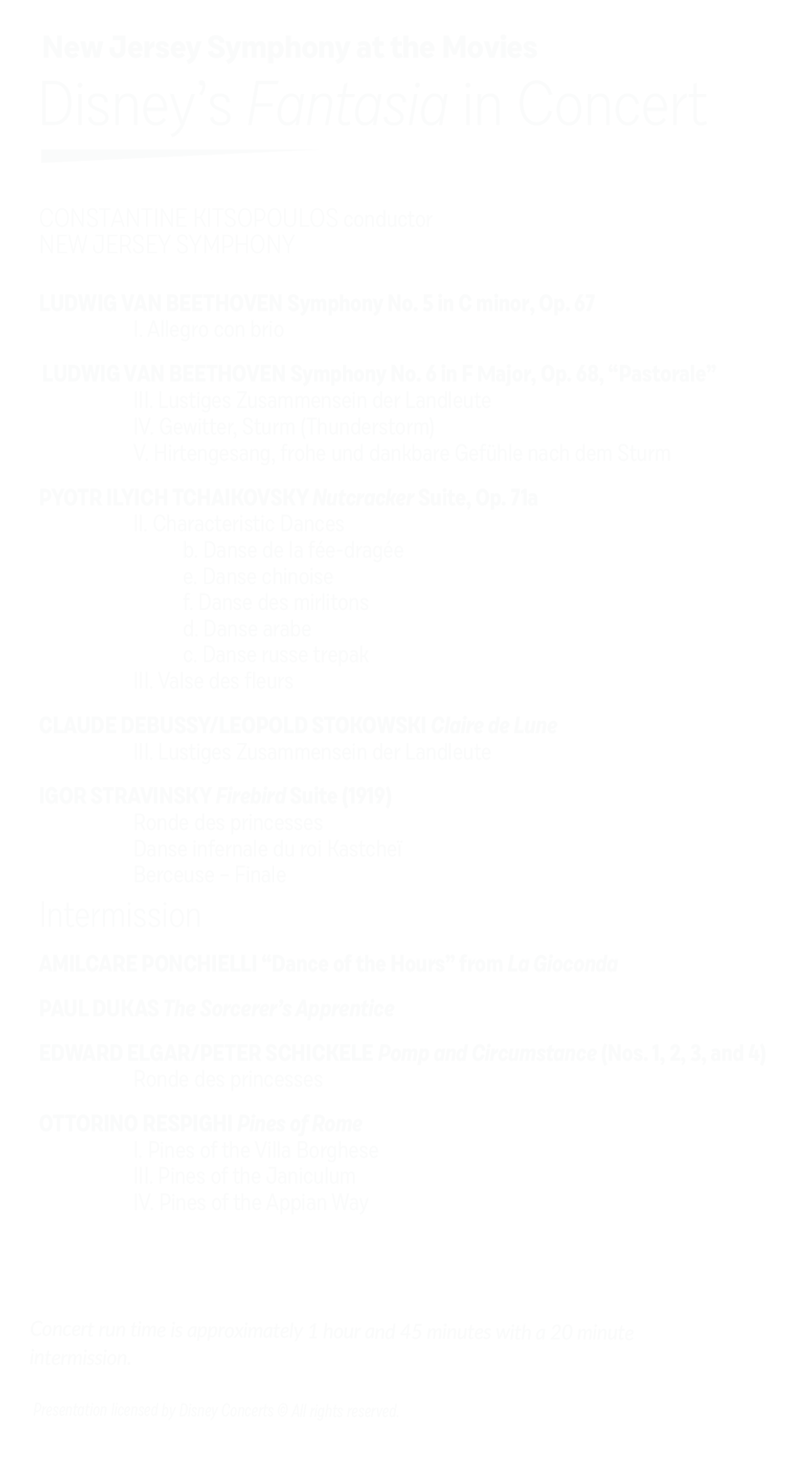 Classical selections include Beethoven’s “The Pastoral Symphony,” Debussy’s “Clair de Lune,” Ponchielli’s “Dance of the Hours,” Elgar’s “Pomp and Circumstance,” Respighi’s “Pines of Rome,” and Dukas’ “The Sorcerer’s Apprentice,” and more.