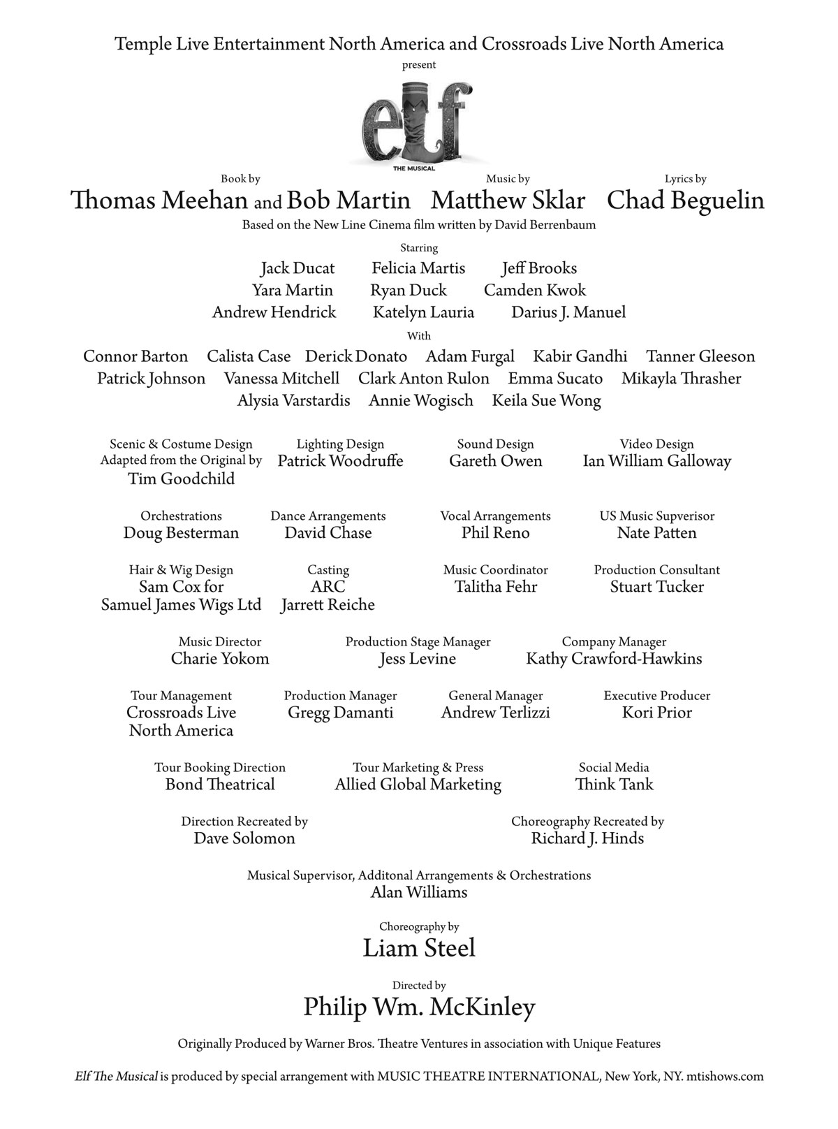 Scenery by Great Lakes Studios, Cigar Box Studios, PRG, and TTS Studios. Lighting & video equipment from PRG. Sound equipment by Sound Associates. Rigging by Phoenix Lighting and Rigging. Rehearsal Studio: Gibney Studios, NYC. Trucking by Clark Transfer. Touring Company Lobby Signage by Express Signs in Frederick, MD. Tailoring by Taylor Harrison, Kaitlin Turek, Kaileen Langstone, and Kimberley Wilkes. Buddy executed by Eric Winterling, Inc. Select Jovie costumes executed by Arel Studio, Inc. Jovie’s Shirt executed by Cego Custom Shirt Maker. Millinery Executed by Arnold S. Levine, Inc. North Pole Elves and FP Finale Jackets executed by Bethany Joy Costumes, Inc. NP Elf Legs executed by Randy Carfagno Productions. Mrs Hobbs’ Robe and Finale and Deb Finale executed by Vedette Costumes. Santa executed by Fritz Masten. Select Macy’s Elves and Velvet Leggings by SoHarlem, Inc. Select Macy’s Elves executed by Threaded Pine. MP Finale Costumes executed by Siam Costumes International LTD. Custom Belts executed by Sherry Accessories, inc. Ice-skate blades by Mio Design NYC.