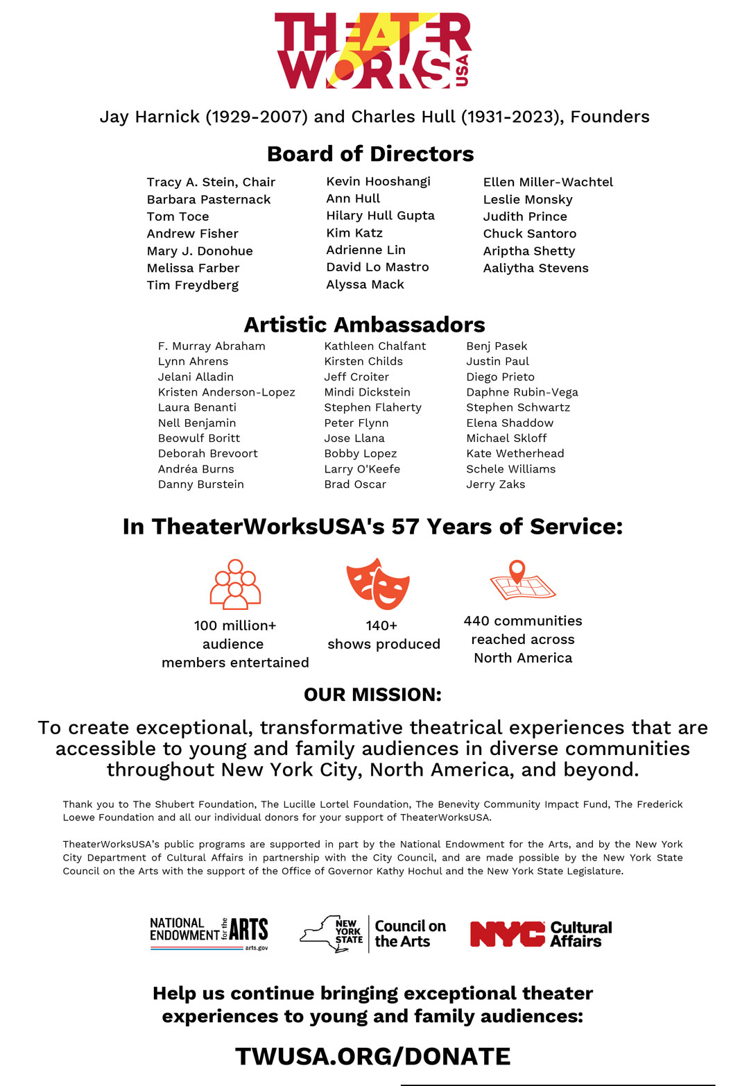 Lighting Equipment provided by Christie Lites; Scenery built by Tom Carroll Scenery; Scenic maitenance by Hillbolic Arts and Carpentry; Softgoods by Rosebrand; Props by Lake Simons; 80HD Puppets built by Alex Choate; Housing arrangements through Located; Trucking by Mark 2 Logistics; Press by Kent McIngvale, Kent McIngvale & Co. | ||||