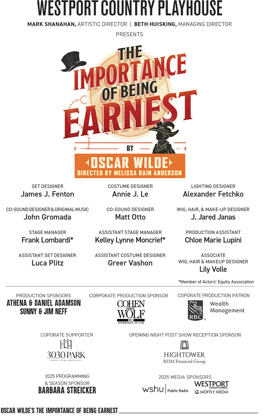 Westport Country Playhouse gratefully acknowledges Hartford Stage Company and Kurt Hultgren for providing additional costume rentals. Their contribution helped bring our characters to life onstage.