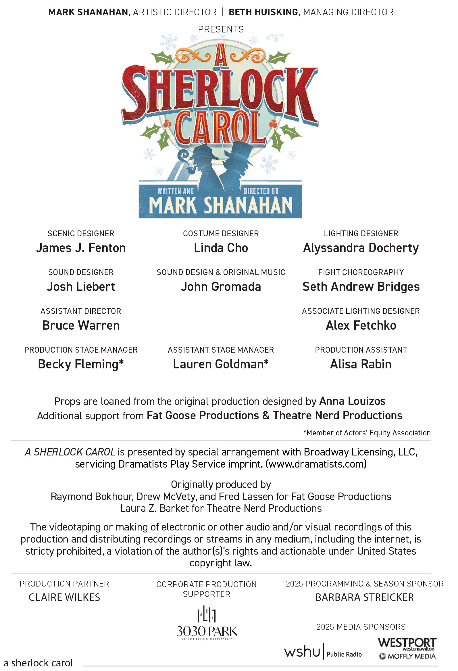 The videotaping or making of electronic or other audio and/or visual recordings of this production and distributing recordings or streams in any medium, including the internet, is stricty prohibited, a violation of the author(s)’s rights and actionable under United States copyright law.
