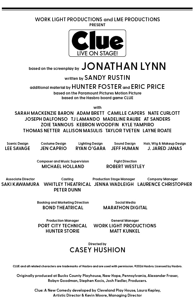 LAYNE ROATE (u/s Wadsworth, Mr. Green, Professor Plum, Mr. Boddy and others, The Cop and others). National Tour: School of Rock. Regional: RENT (Weathervane Playhouse), Annie (Kauffman Center), American Idiot (Victoria Theatre), Titanic (Music Theater Heritage), School of Rock (Starlight), Freaky Friday (New Theatre), Baskerville (Great American Melodrama). Much gratitude to God, Whitley Theatrical, and the Clue Team. Love to family and wife, Morgan.